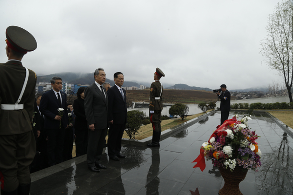 王毅感谢朝方为保护修缮在朝中国人民志愿军烈士纪念设施所作努力,表示要将此作为传承鲜血凝成的中朝传统友谊的基地,教育两国后代继承发扬志愿军的奉献精神,为中朝关系发展提供强大的精神动力。