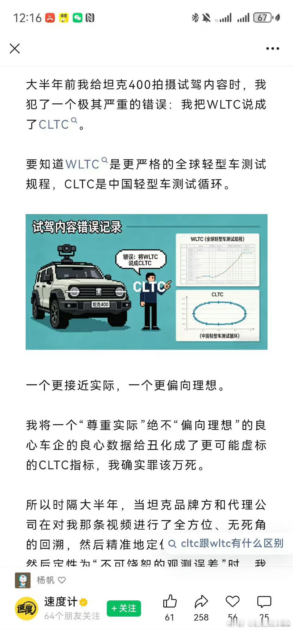 长城一直坚持使用WLTC宣传自己的油耗,博主却因为平时更多车企使用CLTC,用错标准