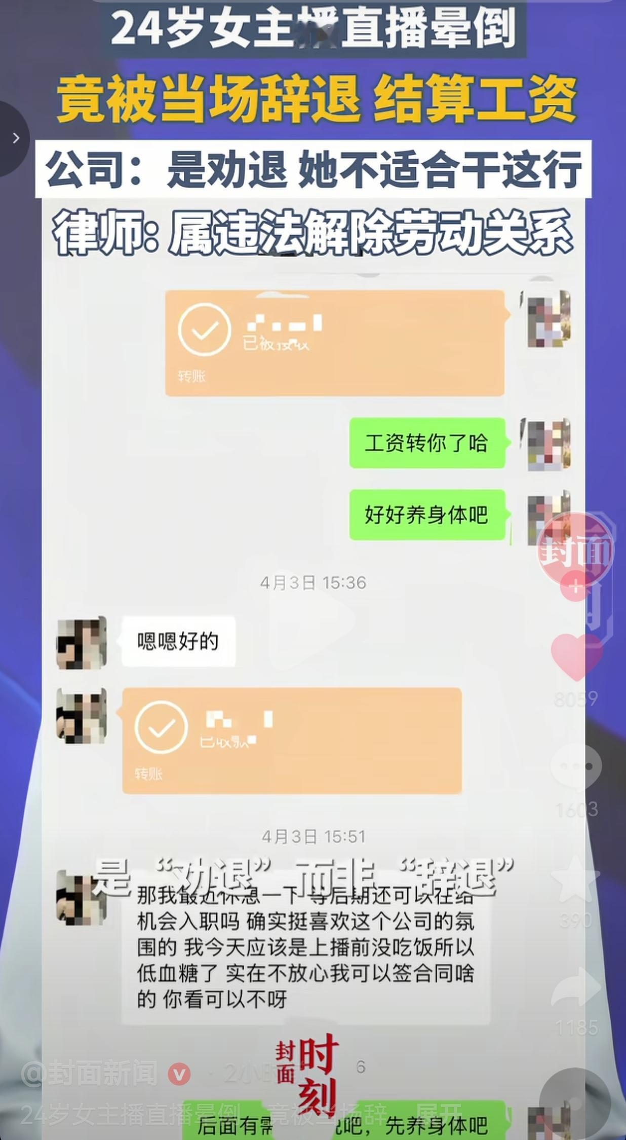 要我说,公司所谓的“劝退”“不适合”,全是借口!就是看员工晕倒了,怕影响直播、怕担责任,直接一脚踢开,连最基本的人文关怀都没有!