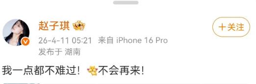 4月11日凌晨,刚被《乘风2026》淘汰的赵子琪辗转难眠,直接在微博发文:“我一点都不难过!不会再来!语气干脆,不留丝毫情面。