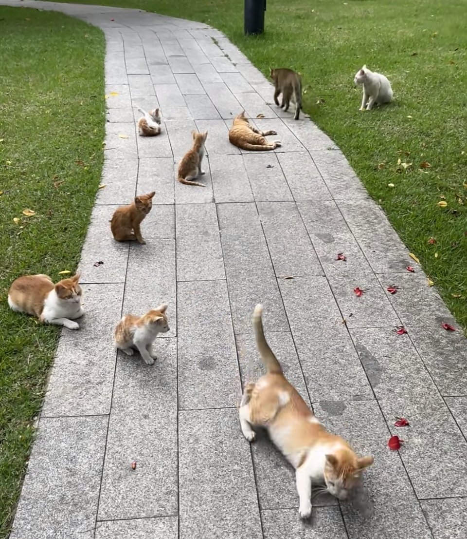 好神奇,遇上了猫猫家族了,九只猫猫啊占据了整个道路,好吧,我绕路。