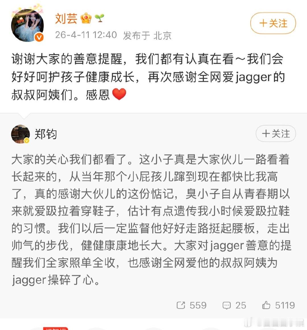 刘芸回应儿子内八问题刘芸郑钧回应儿子内八问题 刘芸郑钧感谢全网为jagger操碎了心 ,全盘接受大家的善意提醒,还说会监督孩子好好走路,健健康康长大