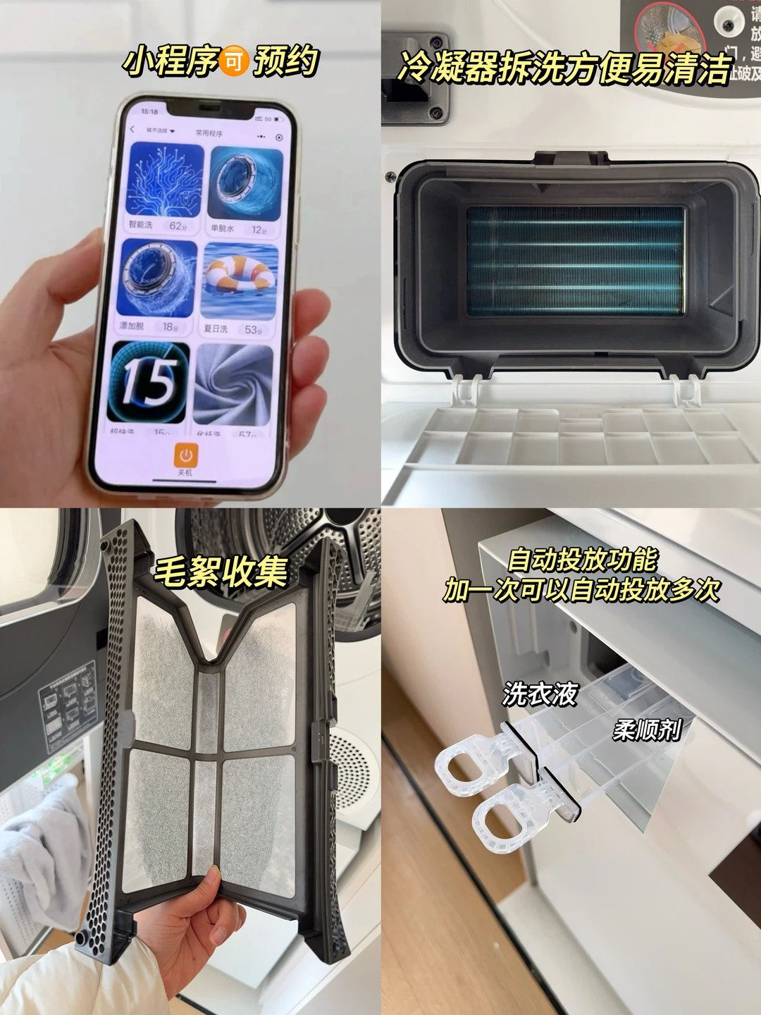 自动投液盒倒一次用3个月,不用每次洗衣手动加液;WiFi远程看进度,陪娃写作业、追剧都不耽误;毛屑盒、冷凝盒拆洗超方便,日常维护零负担。这些小细节,真的把带娃妈妈的辛苦都看在眼里,用起来全程省心又省力。