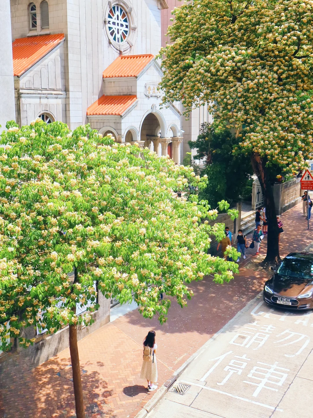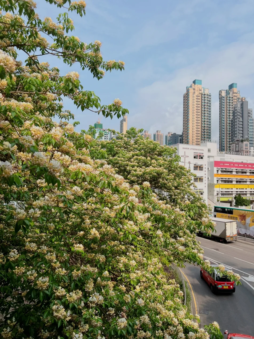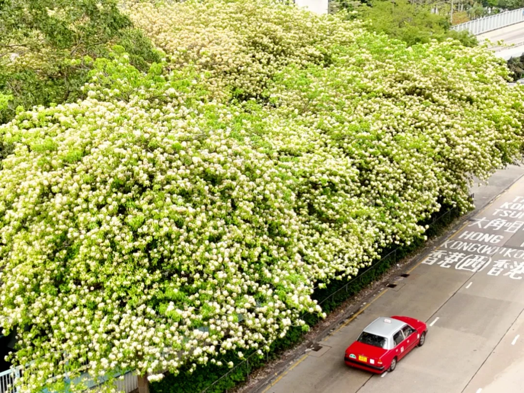 季節限定的鱼木花,不止在圣德肋撒堂和櫻桃街,附近MOKO新世紀廣場出来,整條太子道西都是浪漫鱼木花海!