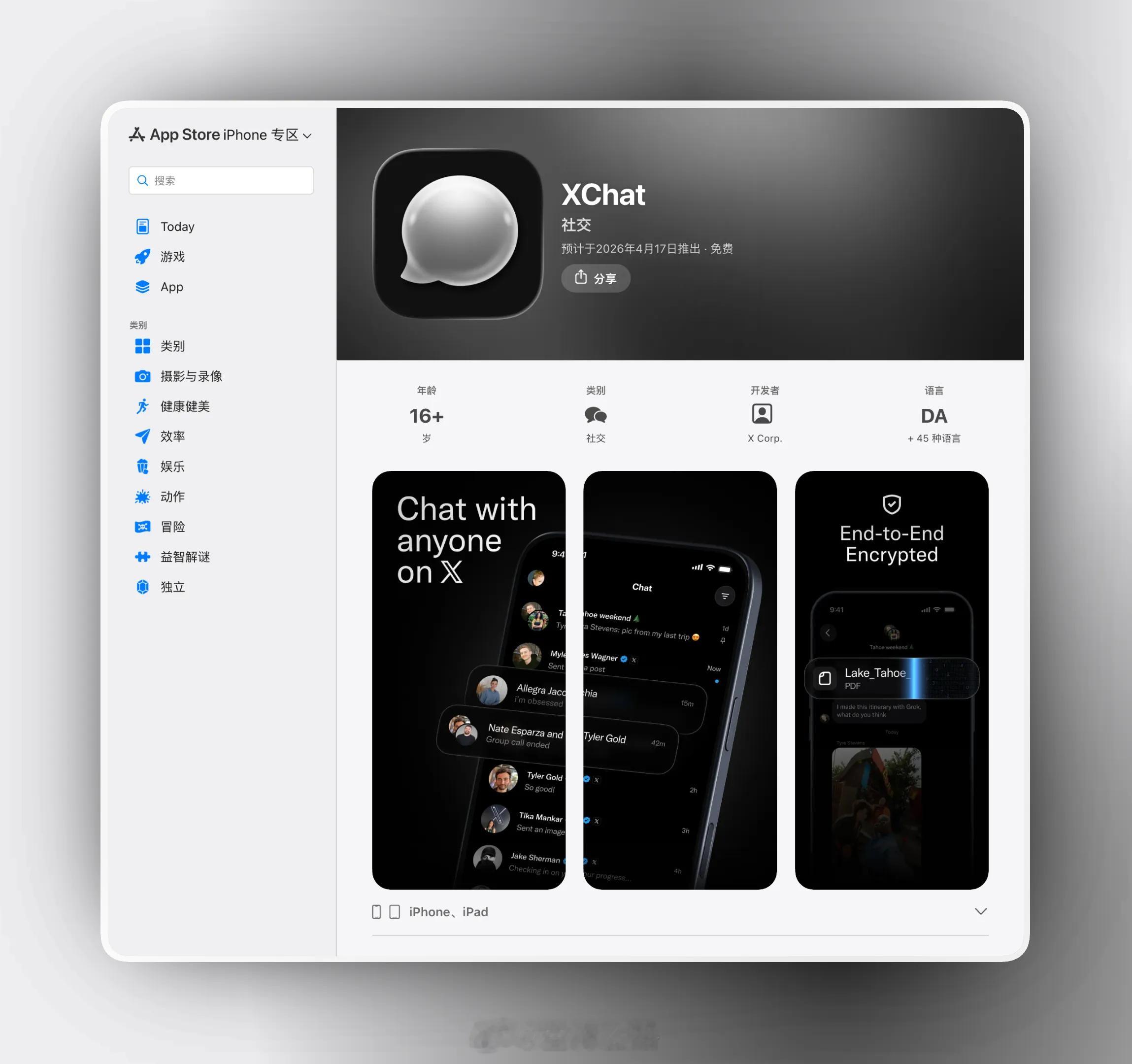 XChat 本质上是 X 平台私信功能的独立升级版,专门打造一个“无广告、无追踪、专注聊天”的私人空间,目前主要面向 iOS 用户,已开放预订(App Store),预计 2026 年 4 月 17 日 正式上线 网页链接 。Android 版本随后会跟进。