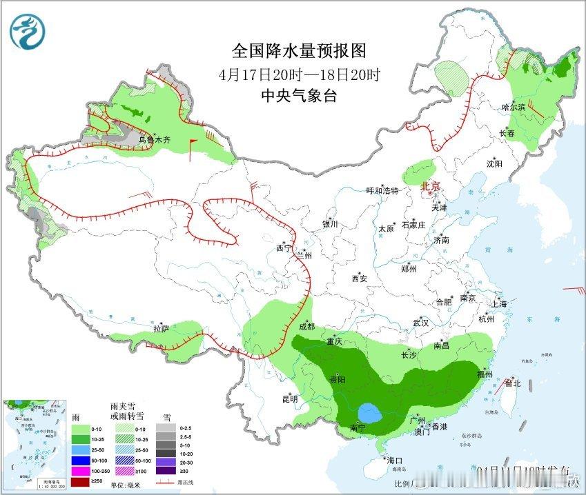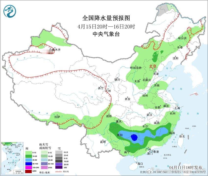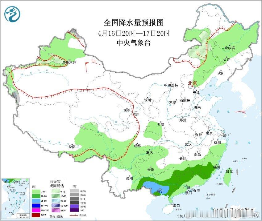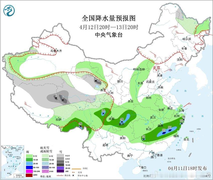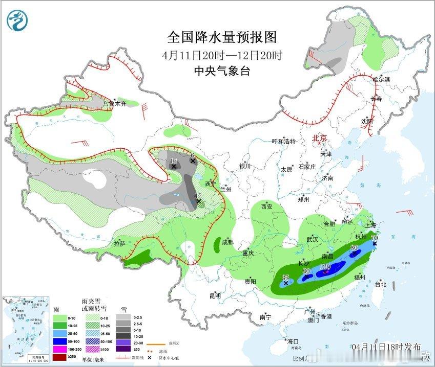 4月11日20时至12日20时,西藏北部、青海南部和东部、甘肃西南部和祁连山山区、川西高原北部、内蒙古东北部、黑龙江西北部、新疆天山西段高海拔地区等地部分地区有小到中雪或雨夹雪,其中,青海北部和东部等地部分地区有大雪,局地暴雪(10~13毫米);