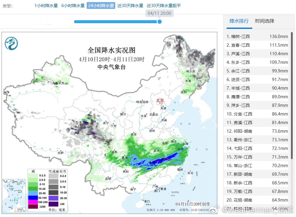 【强降水】昨晚到今天,江南多地继续出现强降雨。江西站点包揽降水榜前十。江西樟树136毫米,排名全国第一,也打破当地4月单日降水量纪录。另外在青海、黑龙江等地出现了降雪。未来3天高原降雪依然频繁,明天南方降雨略向南压,后天强度减弱。但总体看,江南中南部和华南北部,将成为全国降雨最多的地区。