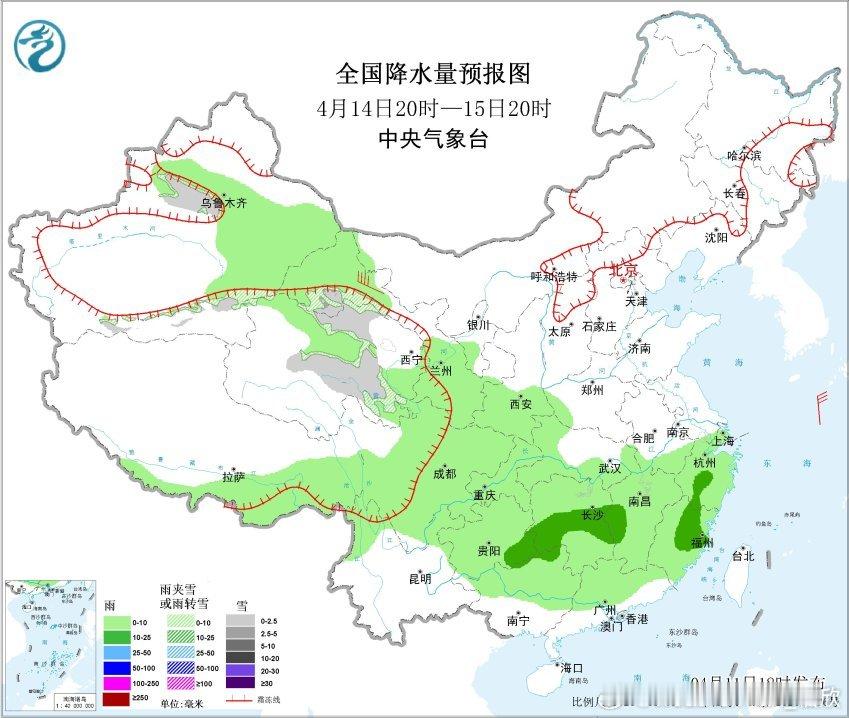 4月13日20时至14日20时,新疆北疆北部和沿天山地区、青海大部、西藏北部、川西高原北部、甘肃祁连山山区等地部分地区有小到中雪或雨夹雪;四川东部、重庆中部、贵州东部、江南中部和北部等地部分地区有中雨,其中,湖南西部、江西东北部部分地区有大雨(25~35毫米)。
