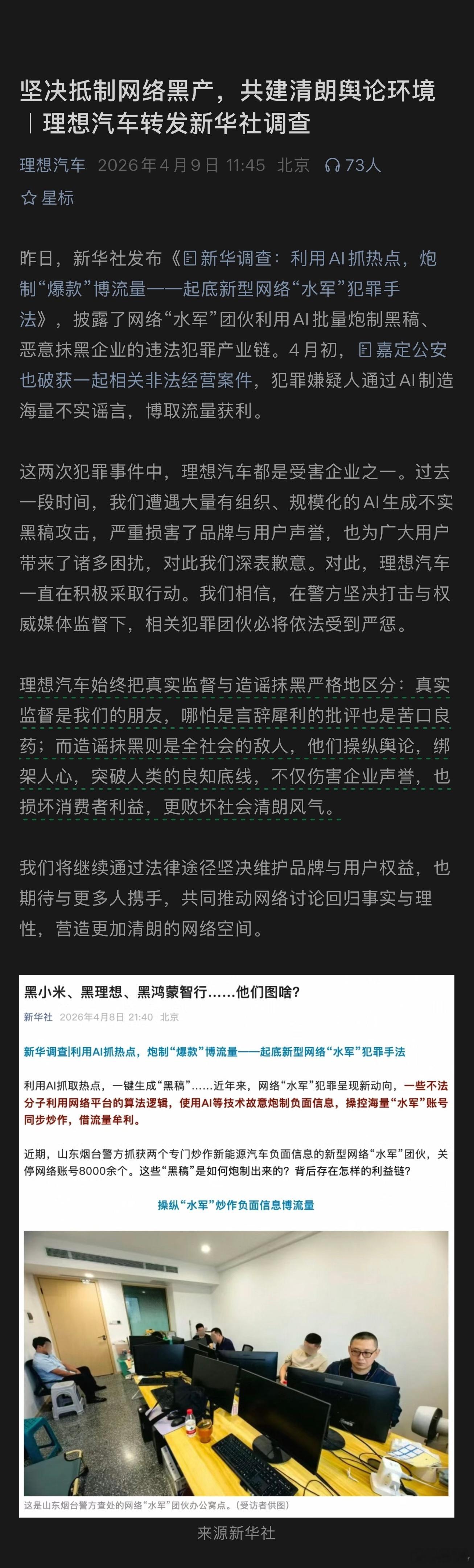 李想今天第4条朋友圈,强调了一下「坚决抵制网络黑产,共建清朗舆论环境」。