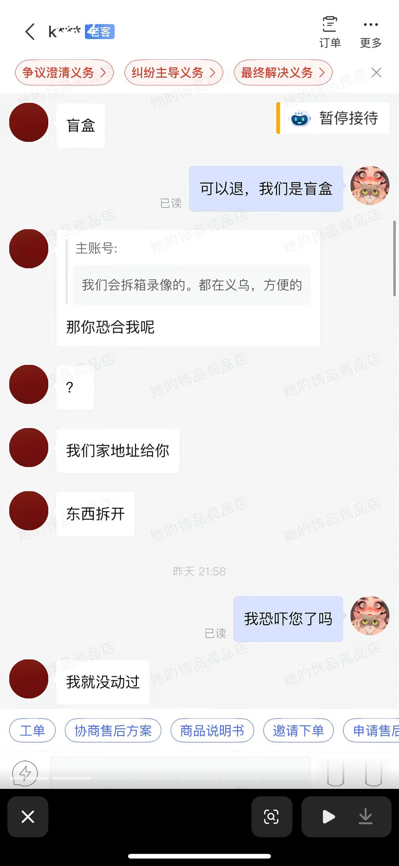 这位多多商家可真惨啊!有个女子在这儿买了盲盒,买了两次,都说拆开不满意,要求退款,就几块钱的东西,女子还要求商家承担运费,还说要分开去寄,让商家承担两次运费。搞得商家气不过,按照地址跑上去门去拿快递,结果一敲开门,女子就开始各种大闹,最后赔了1000块钱。