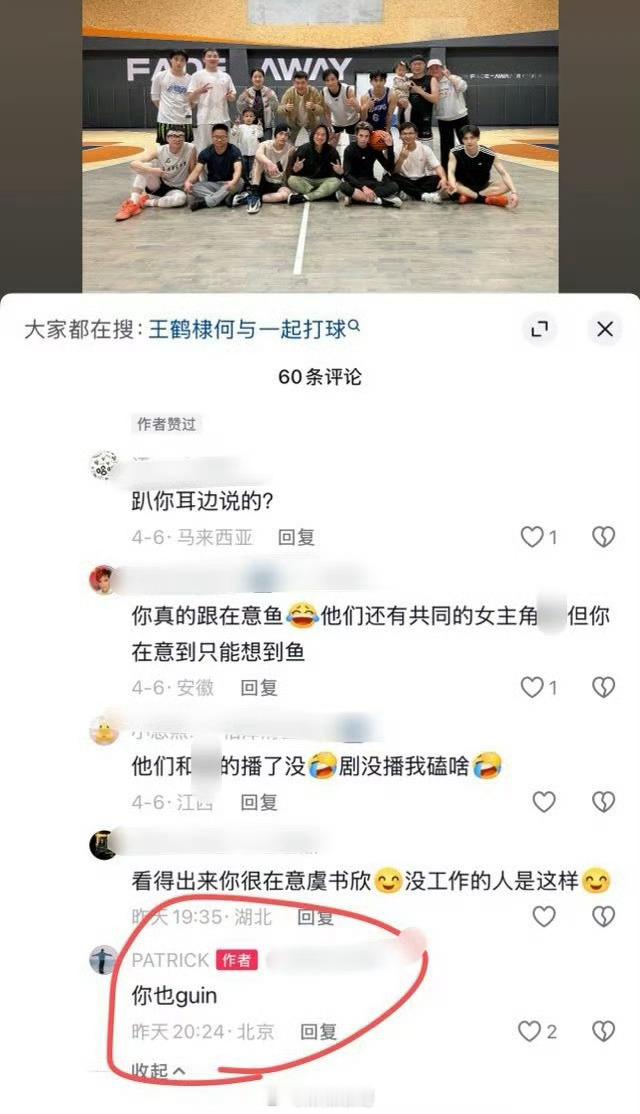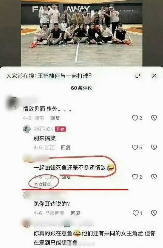 有个博主发了和王鹤棣、何与一起打球的照片,有粉丝跑去评论说“情敌见面,格外……”(因为王鹤棣、何与分别与虞书欣饰演过情侣)