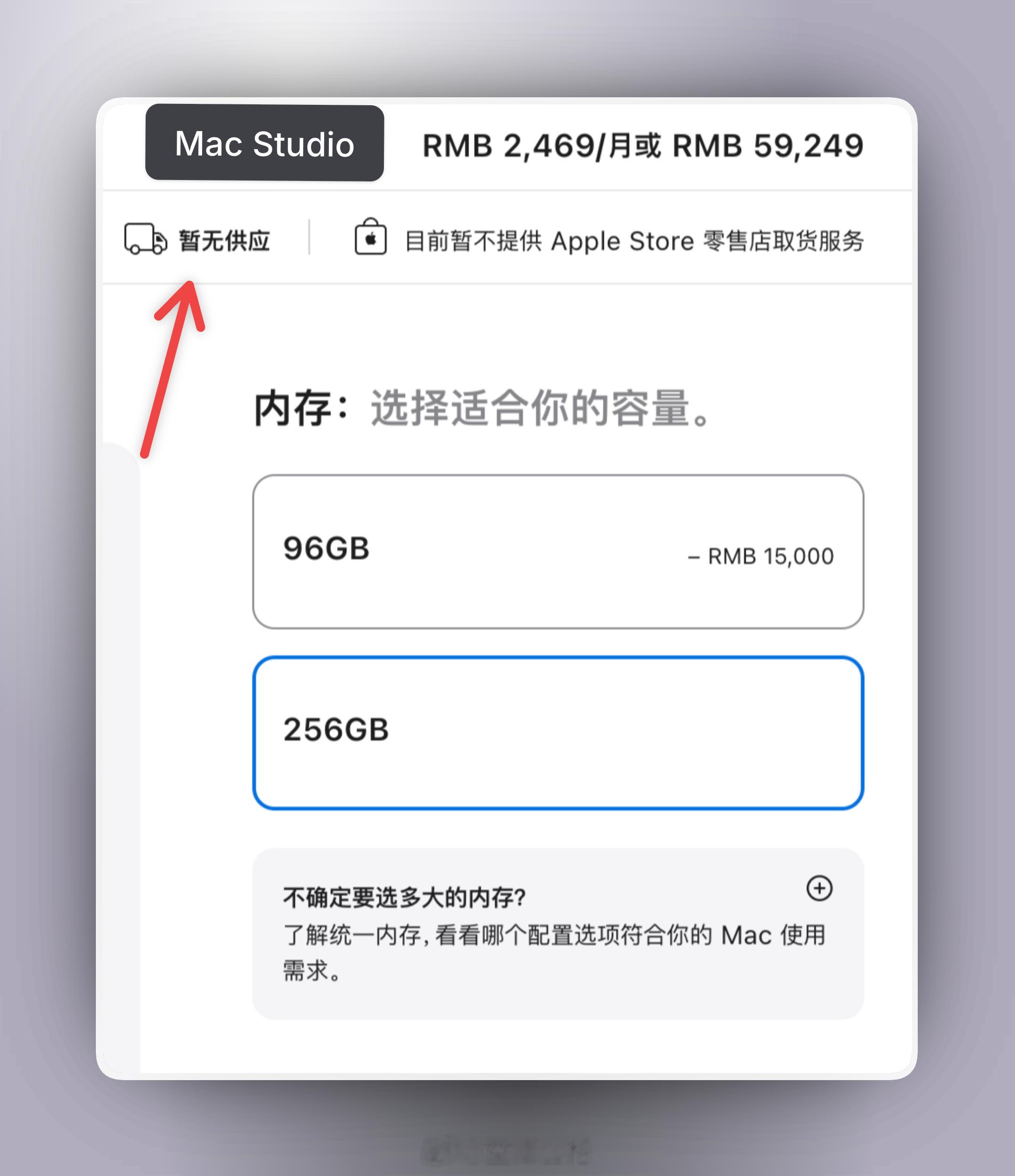 今天苹果全球的官网都显示 Mac mini 的 64GB 和 Mac Studio 的 256GB 内存版本「暂无供应」售罄,而在此之前这些大内存的 Mac 主机是可以下单只不过需要等 2-3 个月。