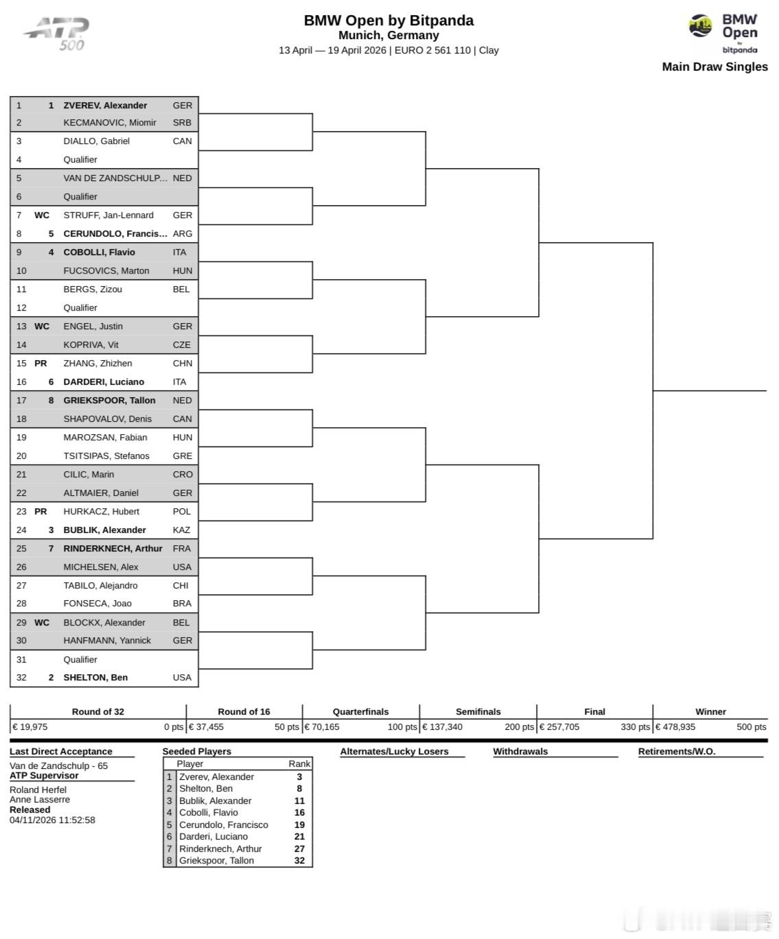 ⭕️ATP500慕尼黑公开赛单打签表出炉🔥📍德国·慕尼黑📅4月13-19日🎾去年冠亚军兹维列夫、谢尔顿以前二号种子领衔,中国选手张之臻首轮对阵6号种子达尔德里。
