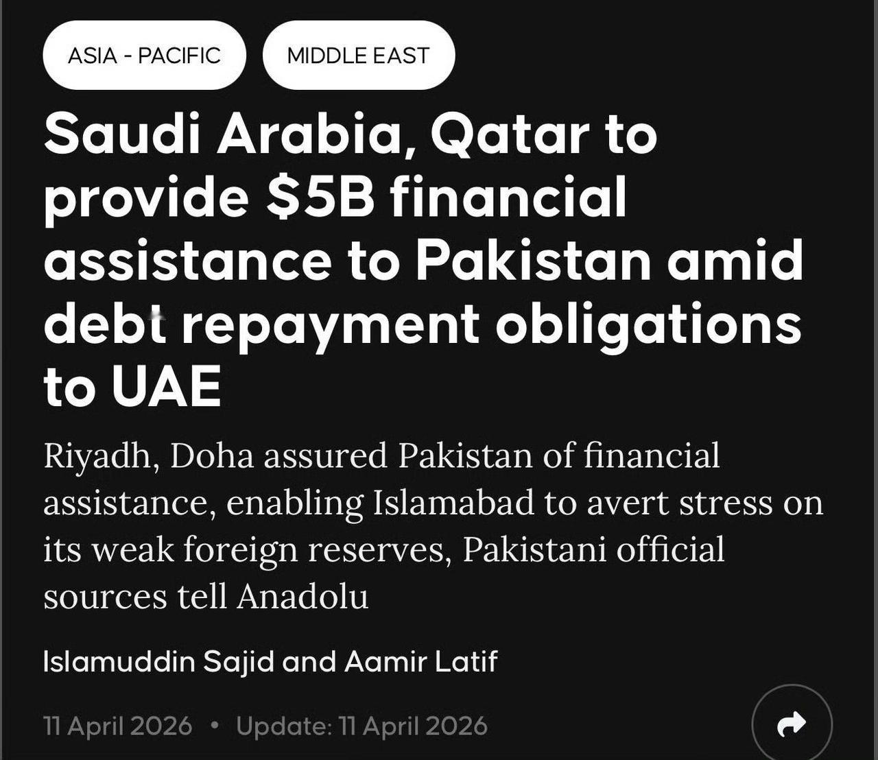 沙特和卡塔尔联合宣布,向巴基斯坦提供50亿美元,偿还拖欠阿联酋的债务。