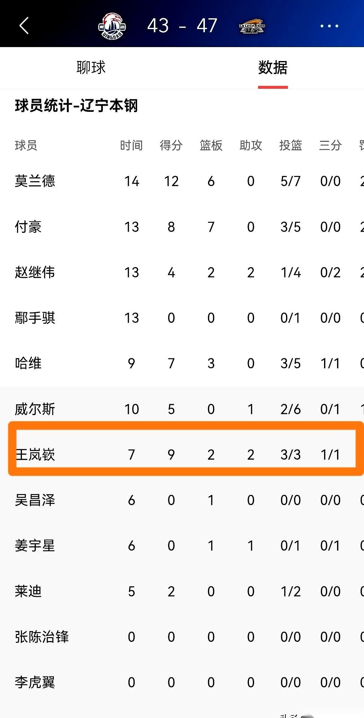 半场哨响,记分牌上写着47比43,辽宁就领先这么4分。