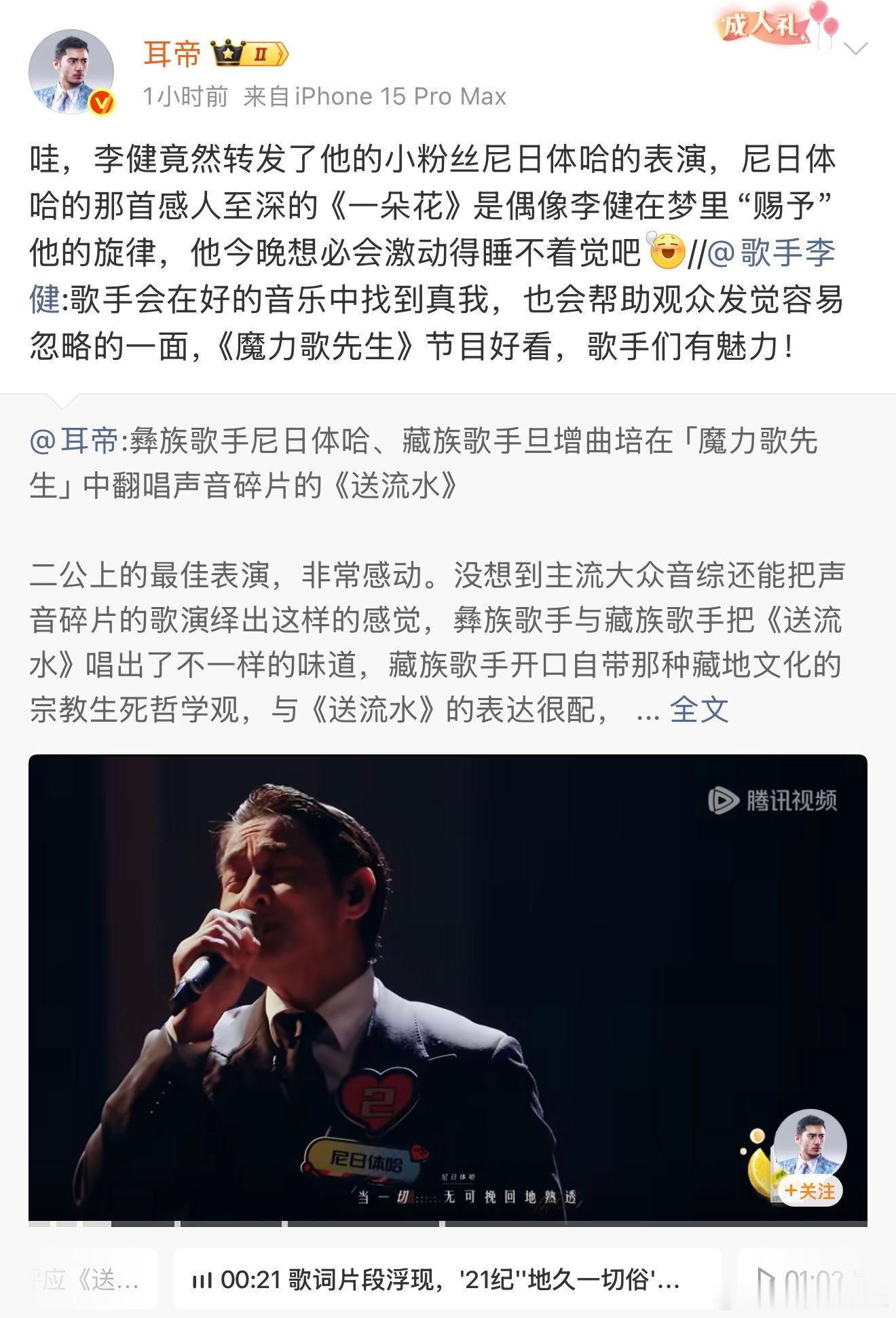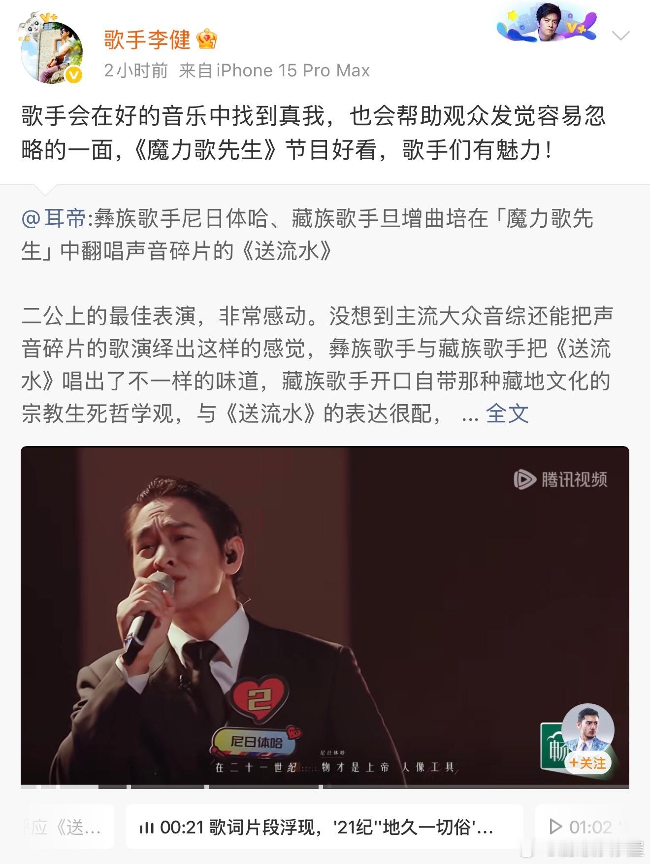 李健被素人唱的送流水打动 尼日体哈这波真的赢麻了!上音综不仅靠出色的舞台质感圈了一大波粉,还直接被偶像李健看见,甚至还被本尊转发认可!只能说一切都值得!《送流水》舞台真的太顶了,开口直接起鸡皮疙瘩,冲击力直冲天灵盖,有这样的实力,被偶像看到也是理所当然!魔力歌先生