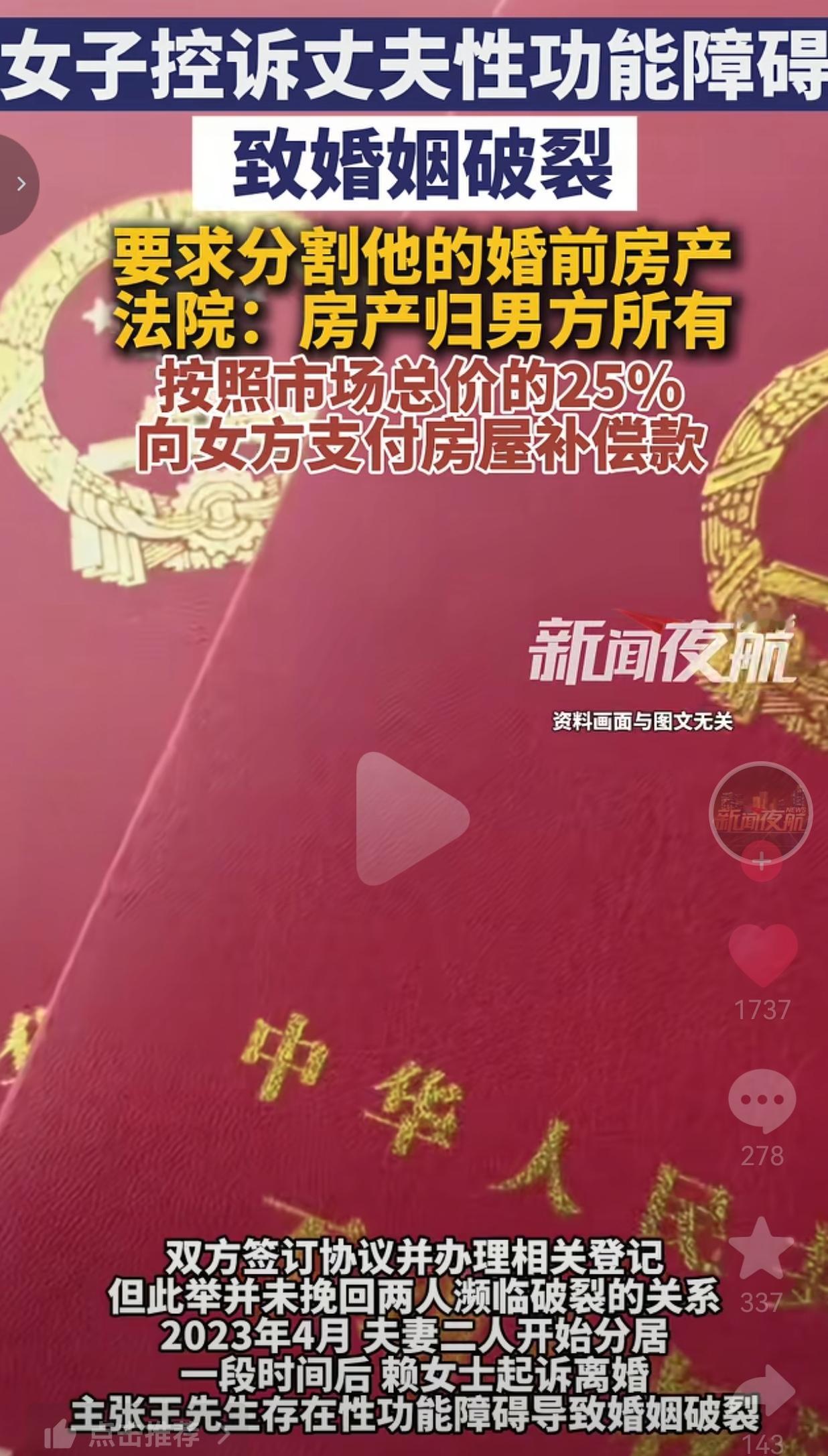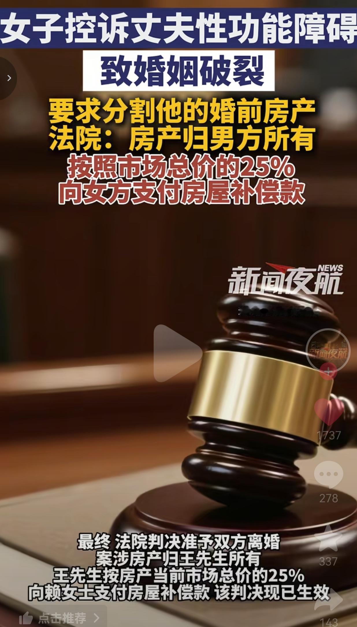 她的理由更是劲爆:王先生身体原因导致婚姻破裂,自己遭受了生育权损失,要求按市场价50%分割这套婚前房!