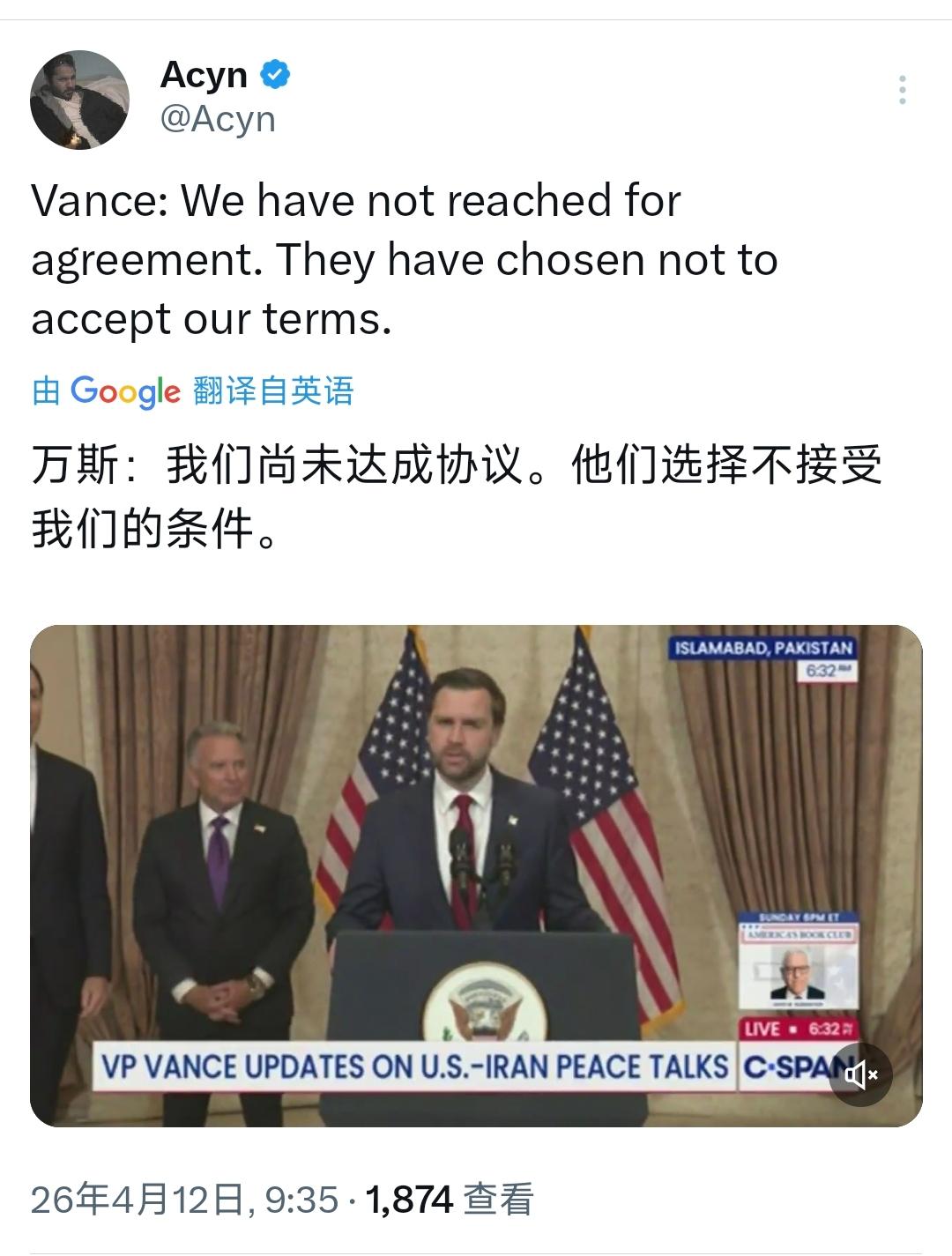 美国副总统JD 万斯刚刚在巴基斯坦首都伊斯兰堡发布简短声明:“我们尚未达成协议。他们选择不接受我们的条件。”