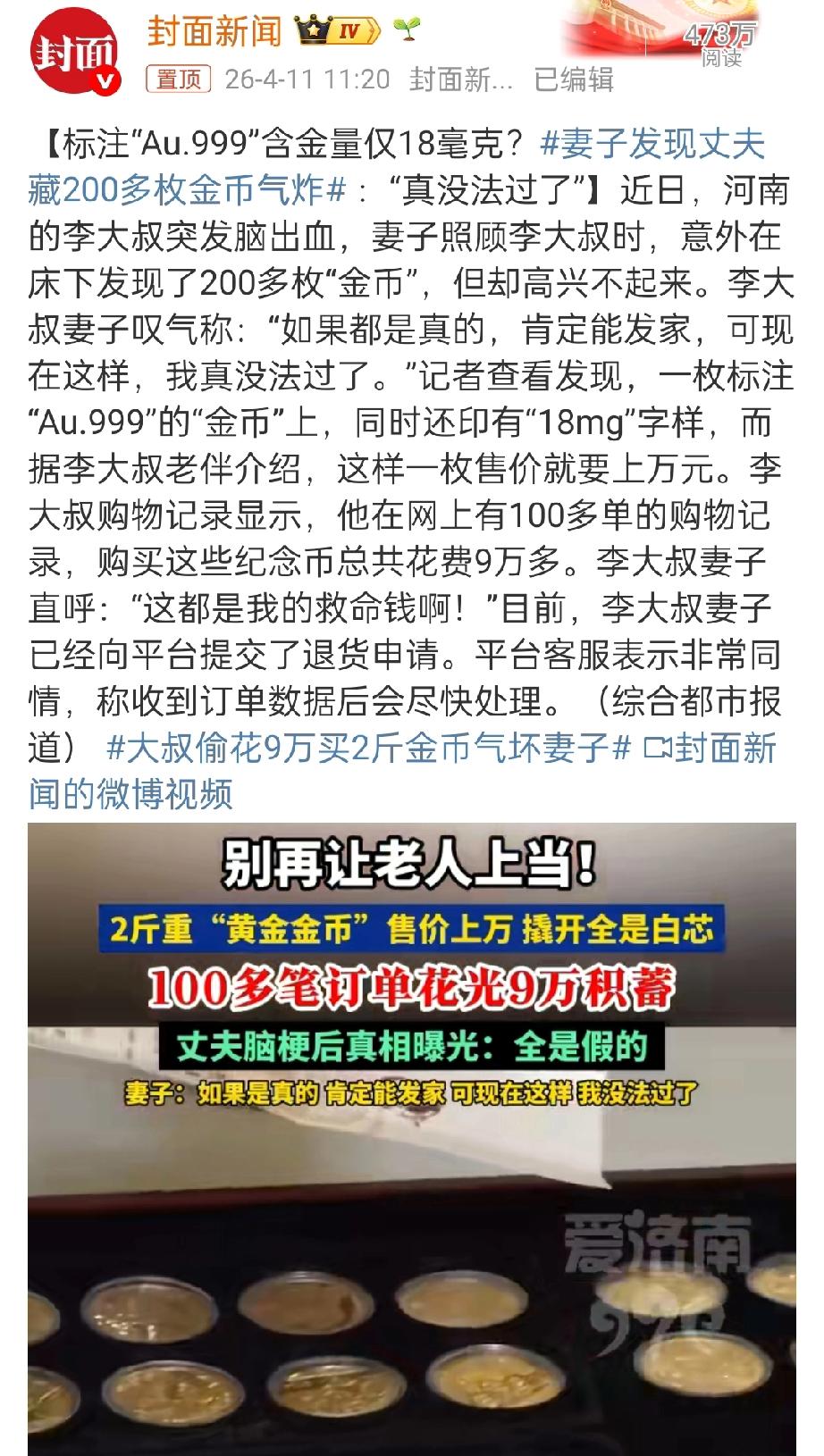 大爷9万买了几百枚金银币,遭遇文字游戏:999千足金只有18毫克,撬开后里面都是白芯…建议报警,这不是文字游戏,这是利用老年人认知能力有限精心设计的诈骗!