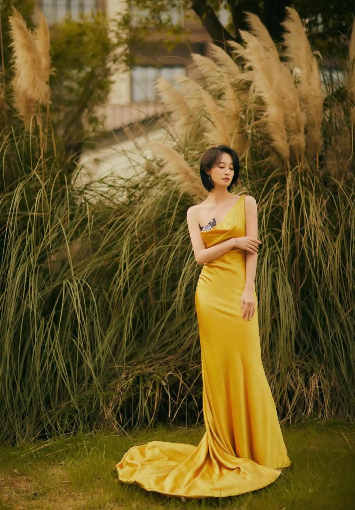 蓝盈莹的奶油黄单肩礼裙造型惊艳全网,完美融合2026春夏流行趋势——柔和的黄油色