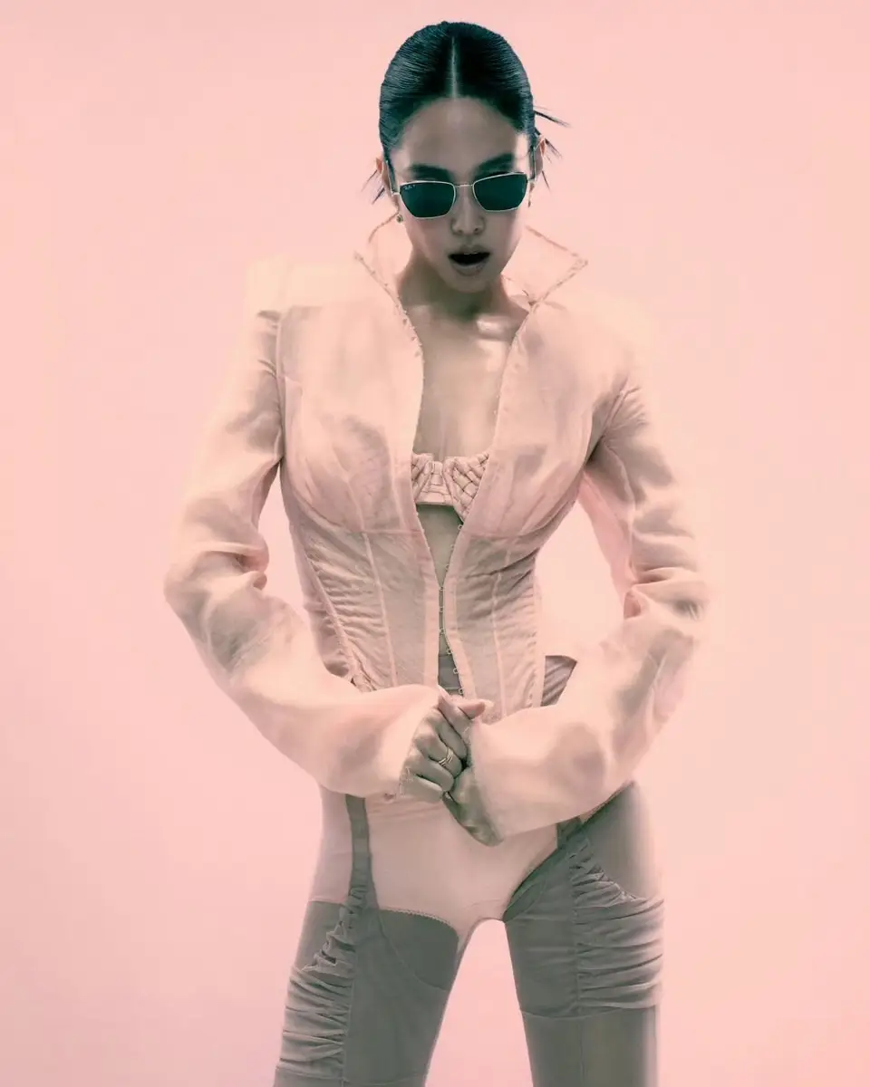 Jennie皮衣粉纱造型演绎雷朋大片 黑长卷发又飒又辣
