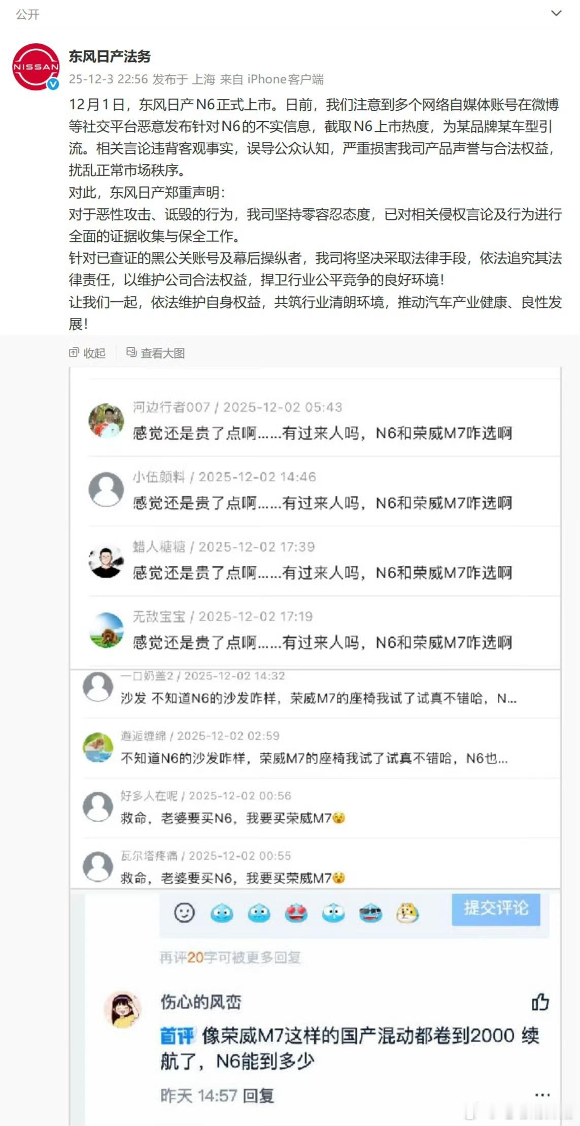 如果这几位企业高管认为集中发拉踩贴、搞水军控评论是正常企业竞争,而不是搞小动作,那我也不太明白为啥图三日产法务部也发文谴责了荣威…