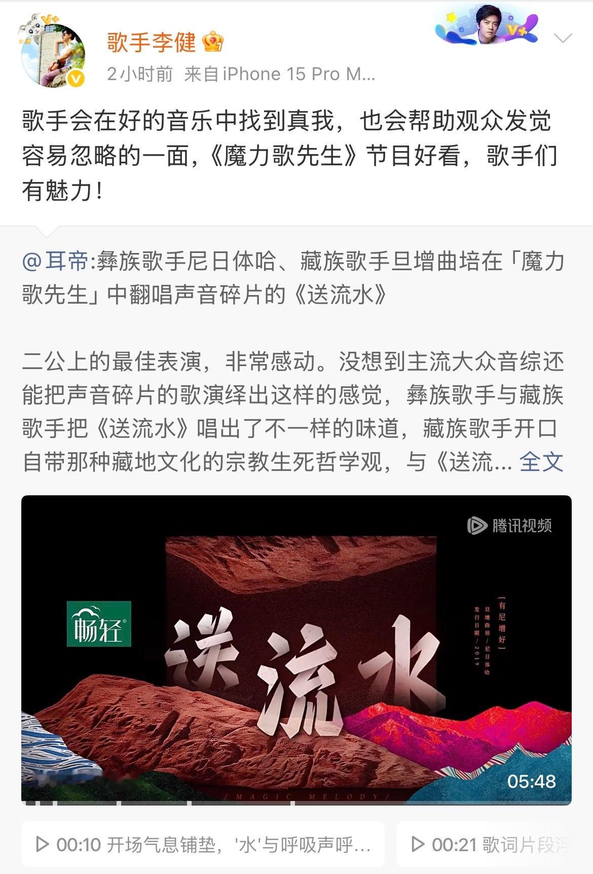 李健被素人唱的送流水打动 连李健都忍不住转发的舞台,含金量谁懂啊!😭尼日体哈和旦增曲培这版《送流水》,真的不是简单的好听能概括的!!一开口,那种万物流转、时光不可追的宿命感直接扑面而来。这种直击天灵盖的震撼,谁能懂!!!魔力歌先生