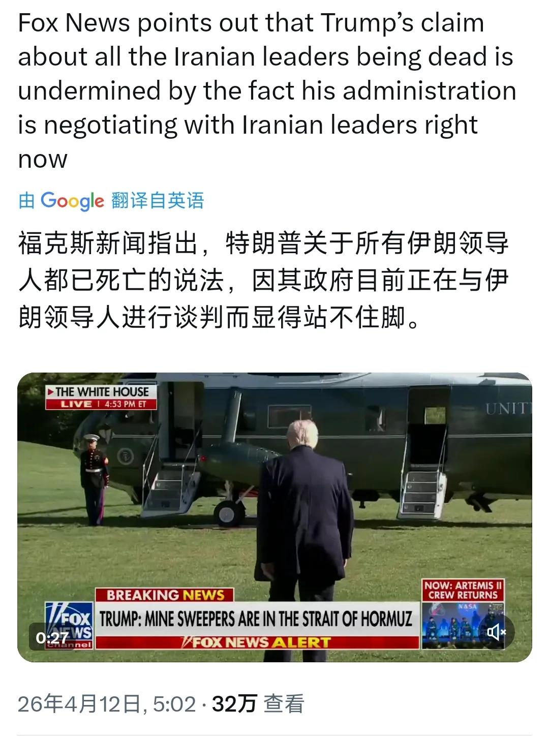 福克斯新闻今天(4月12日)指出:“特朗普关于伊朗领导人都已死亡的说法,因其政府目前正在与伊朗领导人进行谈判而显得站不住脚。”