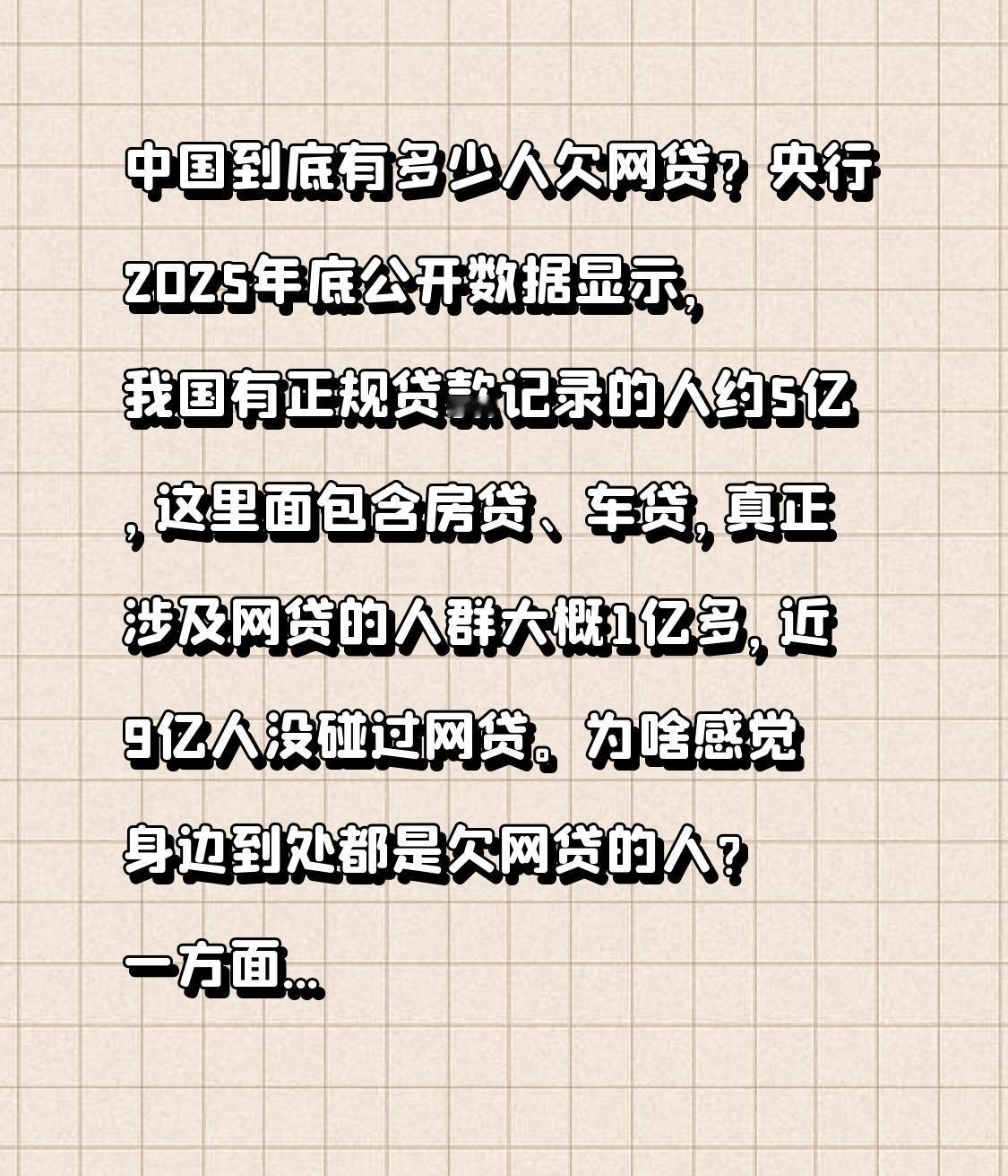 中国到底有多少人欠网贷?央行2025年底公开数据显示,我国有正规贷款记录的人约5亿,这里面包含房贷、车贷,真正涉及网贷的人群大概1亿多,近9亿人没碰过网贷。