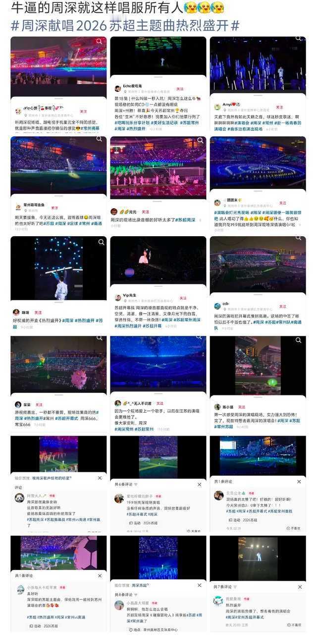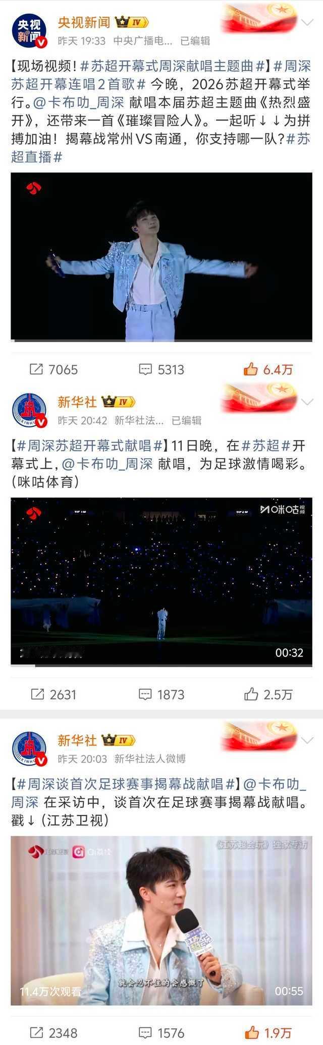 周深彻底点燃苏超开幕式,献唱的赛事主题曲《热烈盛开》MV播放量火速破千万,全网相关话题量突破1.5亿,国民热度直接拉满。