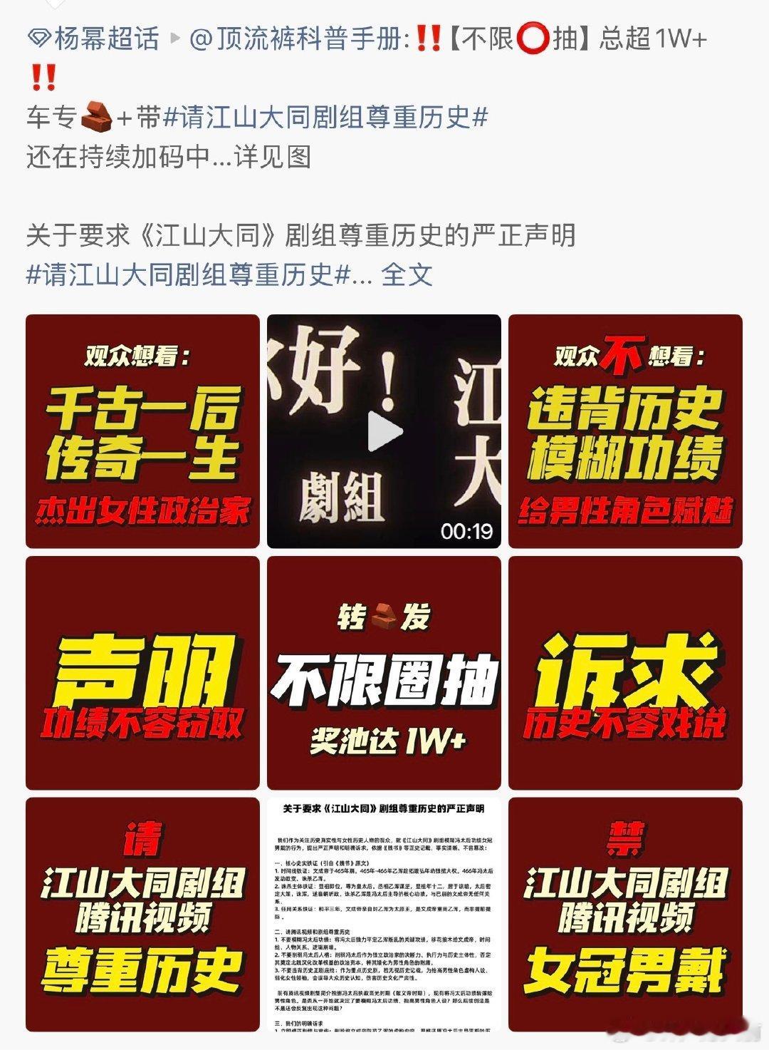 幂粉在为《江山大同》不限圈转发抽奖维权,如果真以冯太后为卖点,却把她的功绩转嫁给别人,那确实很过分了
