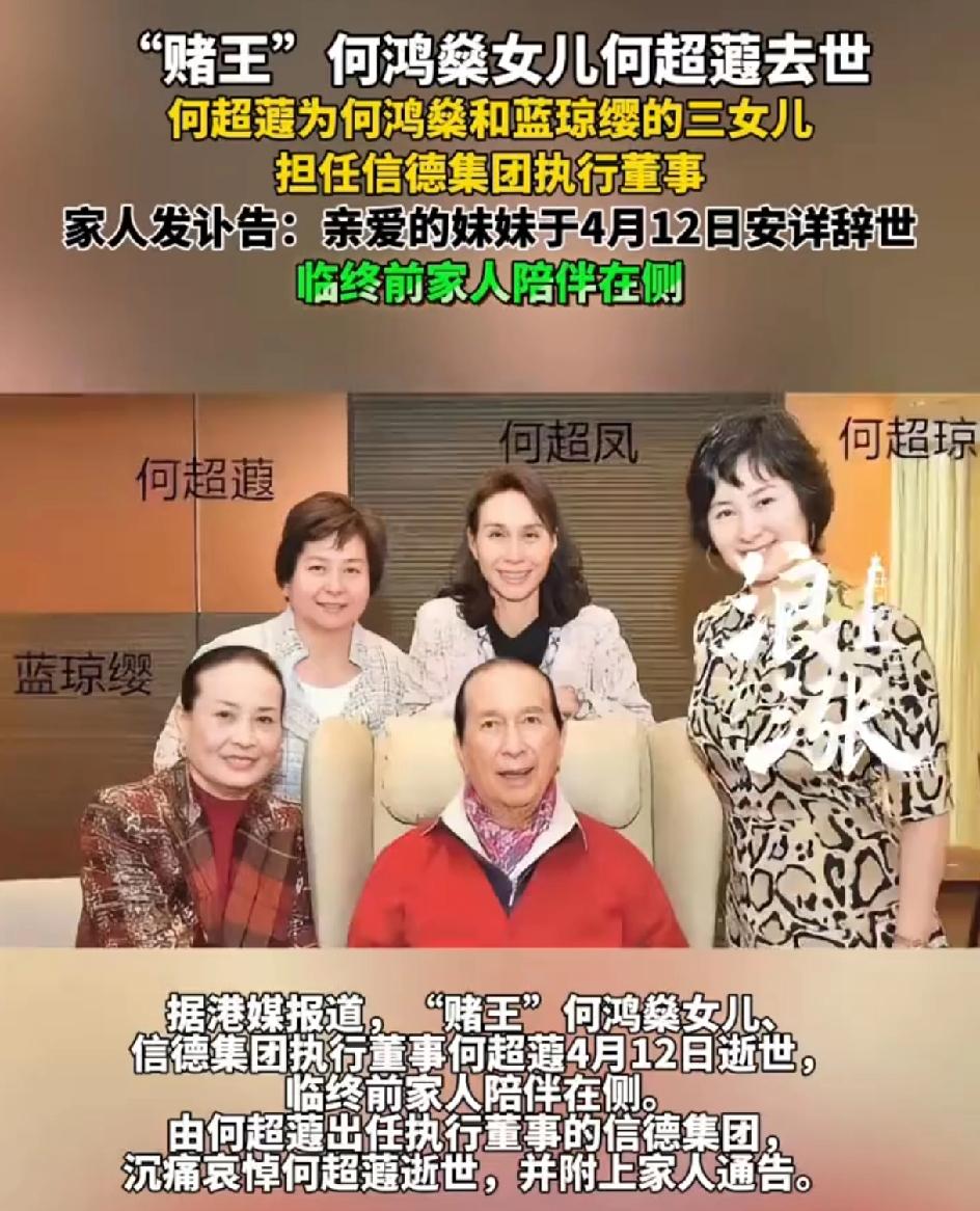 何超琼妹妹何超蕸于4月12日去世了,一辈子未婚未育,年仅六十岁。她的蓝琼缨母亲是赌王何鸿燊最看重的二房。他们5个子女分的财产最多。蓝琼缨。生了5个孩子,四个女儿,一个儿子。赌王最看重的何超琼就是她生的长女。蓝琼缨自己的家世就很好,十几岁就和何鸿燊在一起,死后与何鸿燊合葬。何超蕸姐妹几个长得都很像,都很像父亲。一辈子要风得风,要雨得雨,不知道为什么选择不婚不育。