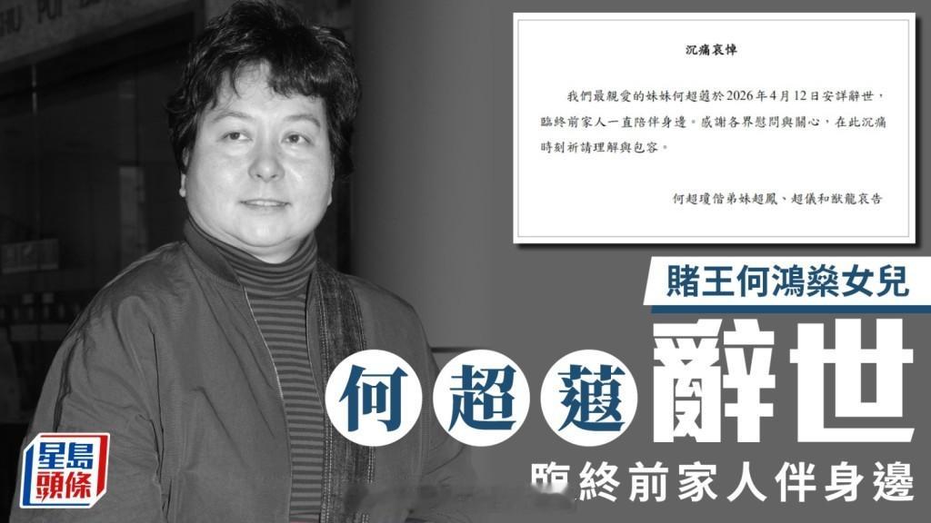 何超琼偕弟妹哀告何超蕸的姐姐何超琼、何超凤、妹妹何超仪、弟弟何猷龙联合发出家属通告:“我们最亲爱的妹妹何超蕸于2026年4月12日安详辞世,临终前家人一直陪伴身边。感谢各界慰问与关心,在此沉痛时刻祈请理解与包容。”字里行间流露出对何超蕸离世的无尽哀痛与不舍。