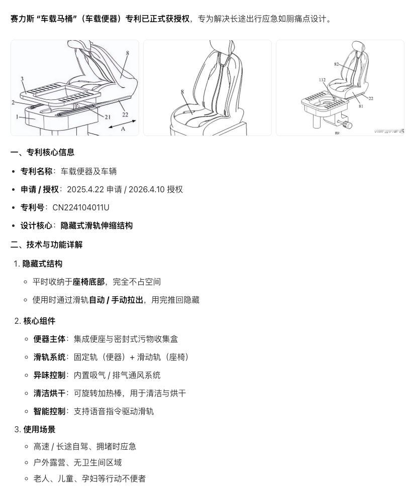 汽车上到底有没有安装 坐便器的必要?其实现在很多房车里就有洗手间,这并不奇怪。只是家用车上很少见。现在已经有极石 和赛力斯 分别就车内 便器进行过开发。赛力斯甚至还申请了专利。