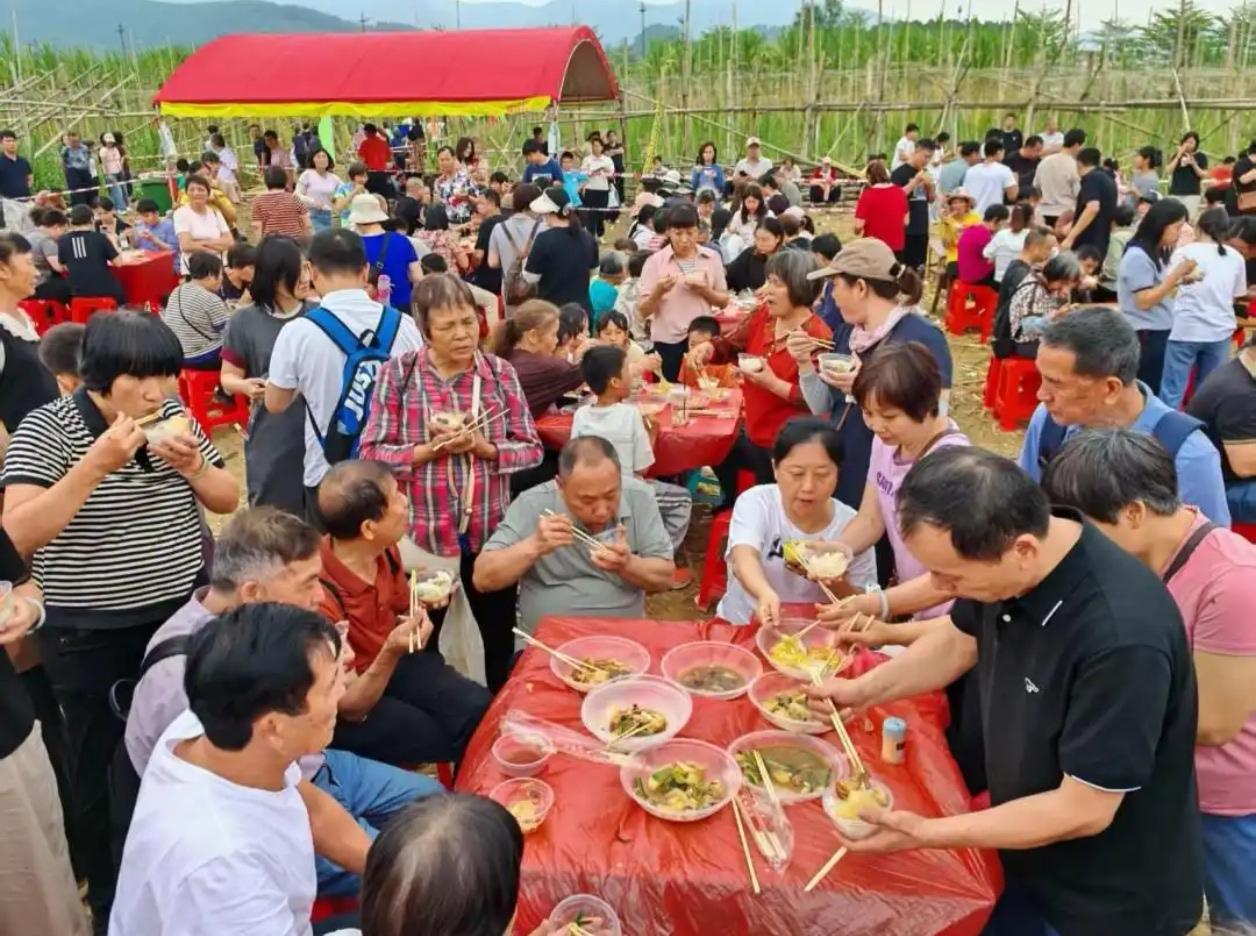 4月11日,广州增城区朱村街的蔗农阿燕在收割完毕的甘蔗地里,摆开了23围充满乡土气息的流水席。红烧肉、时蔬鲜汤、农家小炒…一道道热气腾腾的农家菜端上桌,这不是普通的宴请,而是一场特殊的答谢宴——感谢所有参与“10元3条甘蔗自己砍”活动的街坊游客。