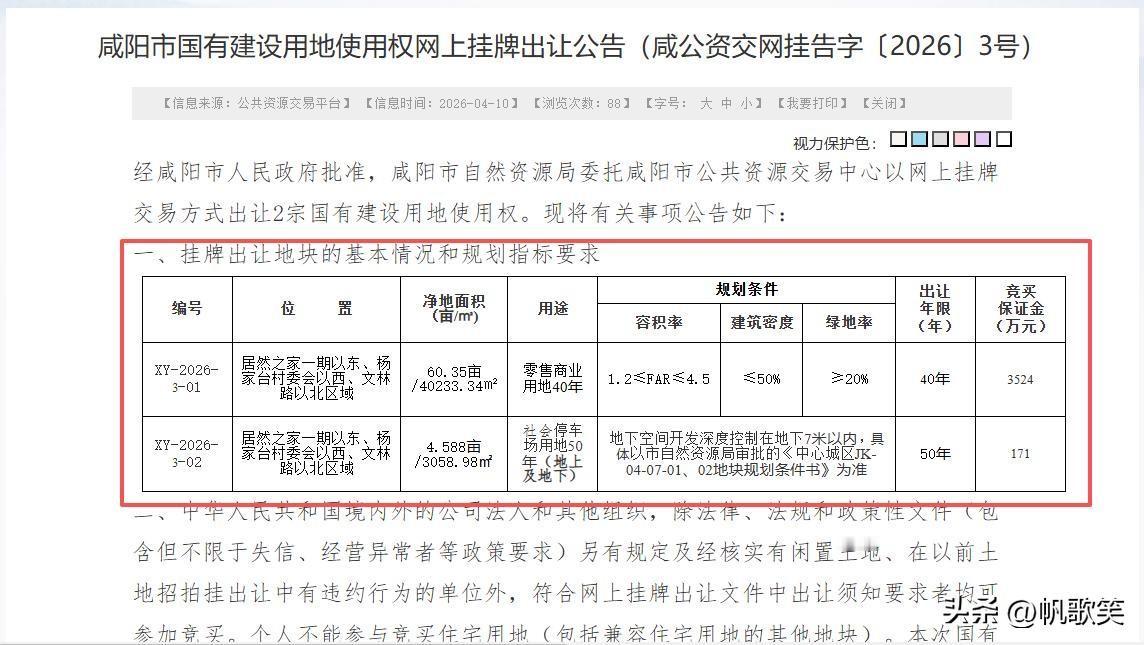 共65亩!咸阳中心城区2宗建设用地挂牌出让,含1宗商业用地… 日前,咸阳市土地