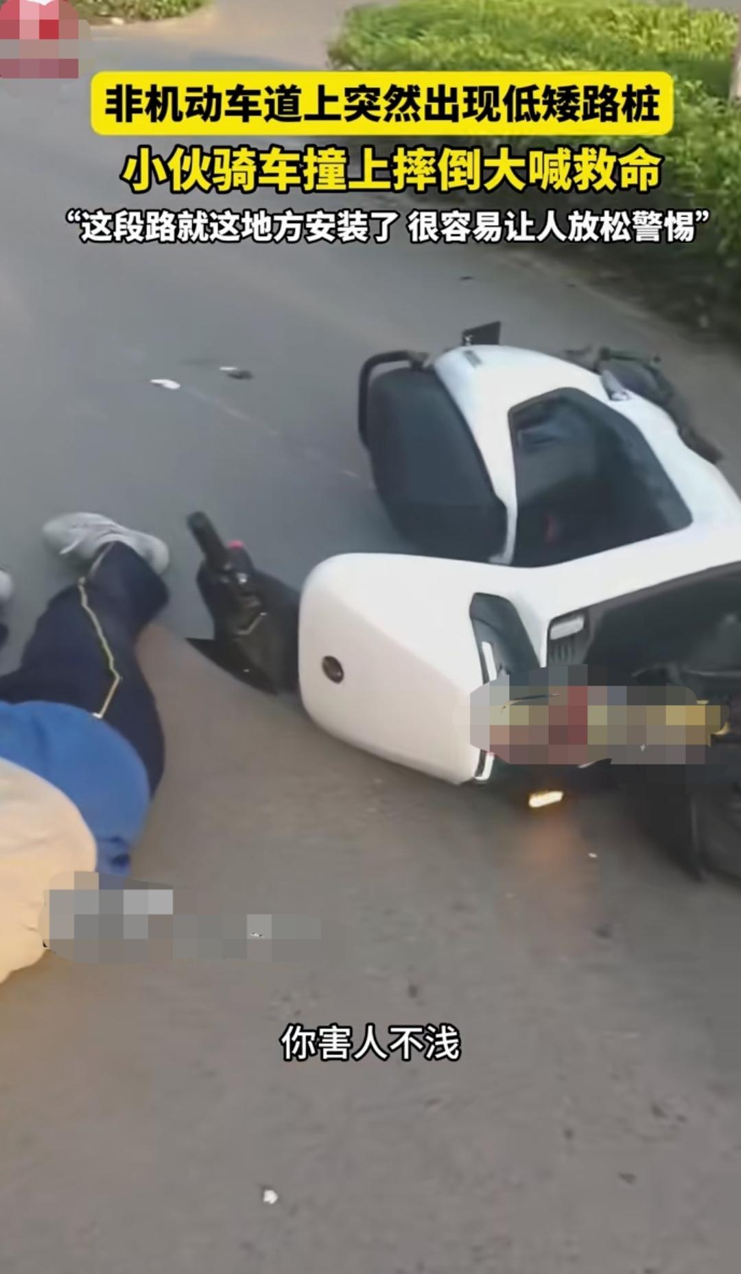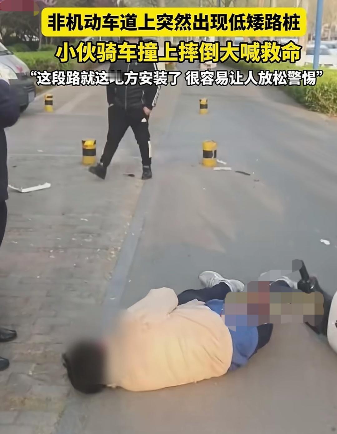 路中设置低矮路桩,不出事才怪!这不,又有一位骑电动车的小伙“栽”在上面了,撞得可不轻!