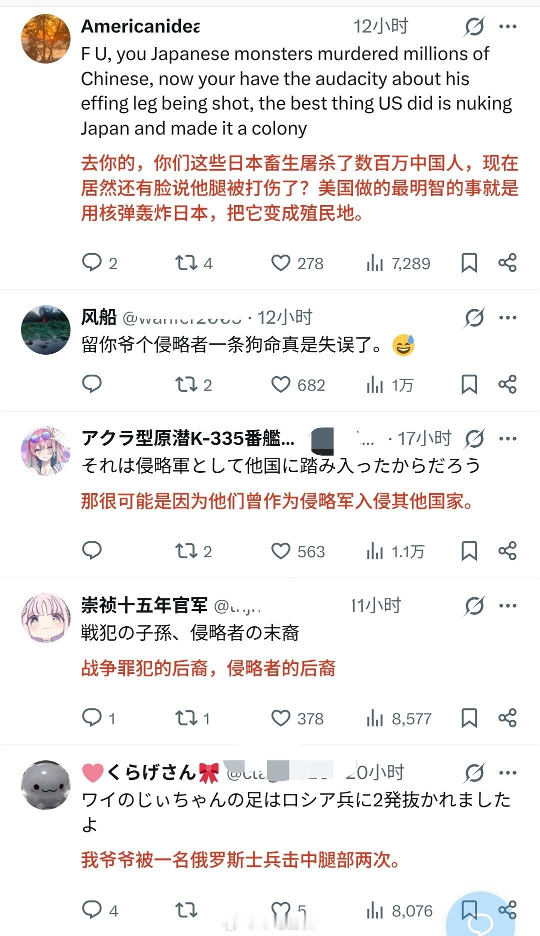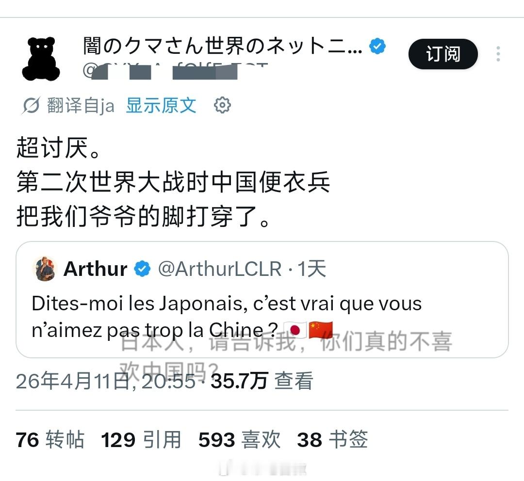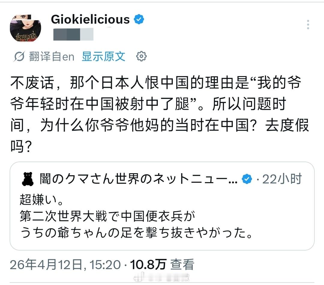 有人问:日本人,你们真的不喜欢东大吗?底下有个日本人回复:超讨厌,因为二战时他们的便衣兵(可能是敌后武工队、游击队)把我爷爷的脚打伤了。被其他人嘲讽“为什么你爷爷TM的当时在中国?去度假吗?”因为他的爷爷入侵他国被反击弄伤,就要恨别人,相信这种日本人不是少数