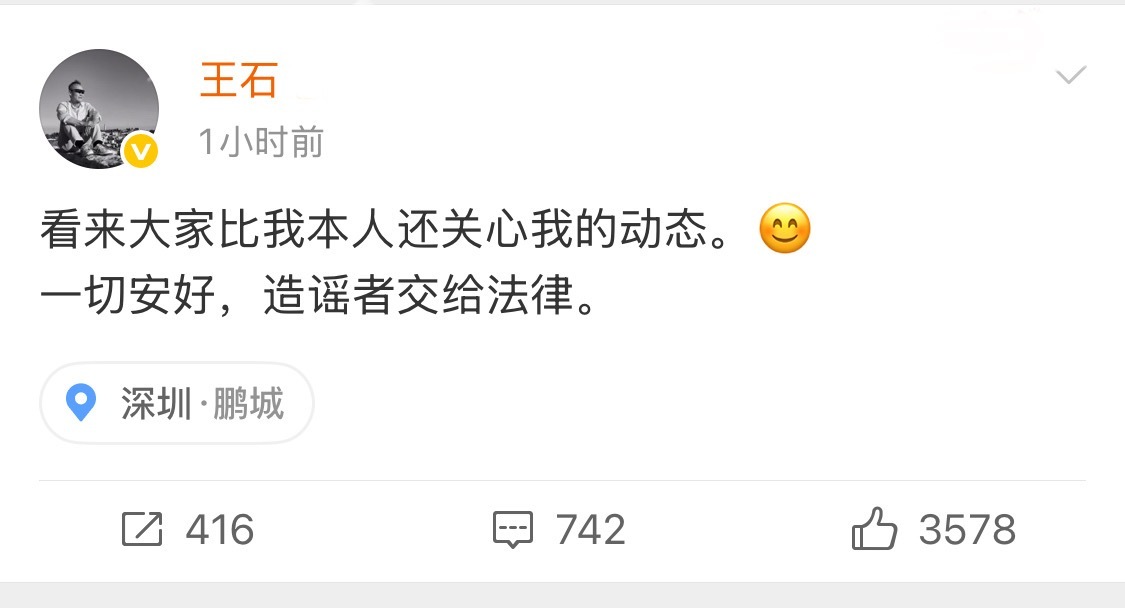 刚刚,王石发文了,定位在深圳,面对网传消息,这个做法是最聪明的,没有什么是比本人出来辟谣还要高效的回应了。不过也有网友表示,“王石先生现在可以直播一下?”可能是觉得本人露面更有说服力?但是真有这个必要吗?感觉不管怎么回应都会有人挑刺。