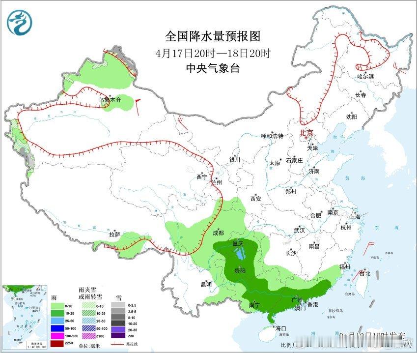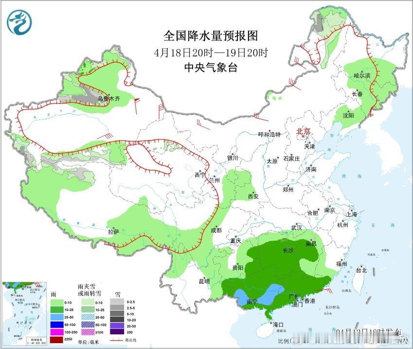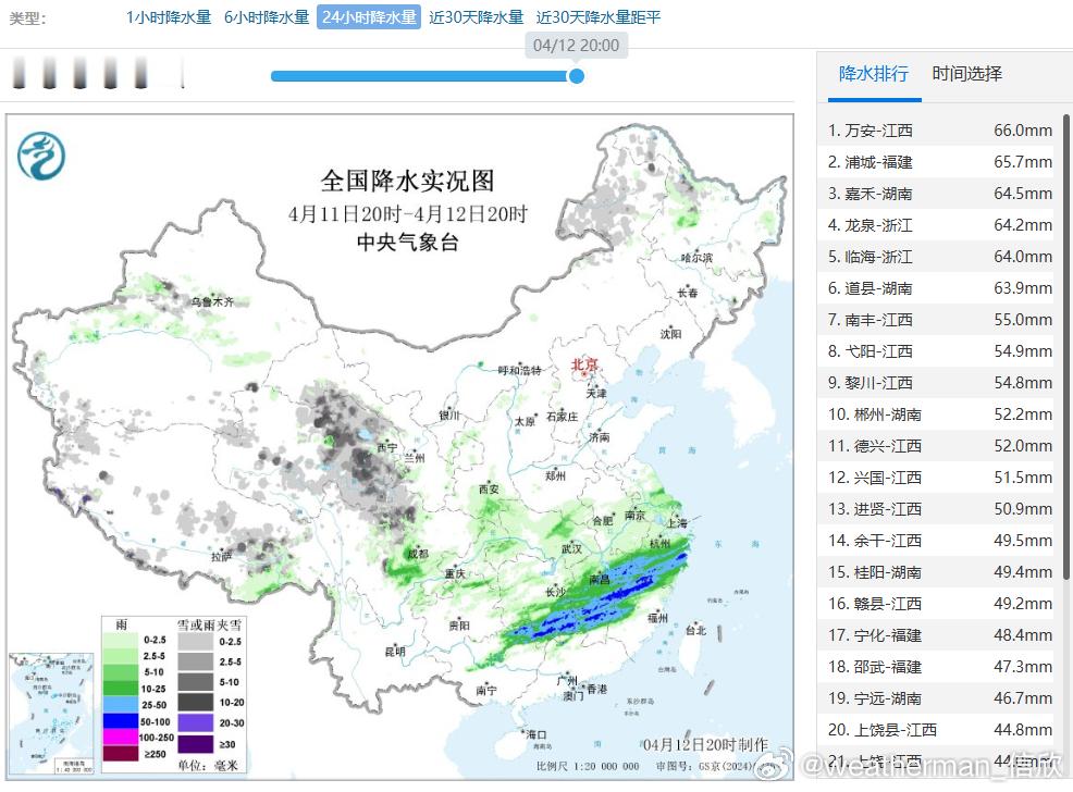 预计4月12日20时至13日20时,黑龙江北部、新疆南疆盆地、西藏北部、青海大部、甘肃河西、川西高原北部等地部分地区有小到中雪或雨夹雪,其中,青海东北部等地部分地区有大雪(5~7毫米);西藏东南部、四川中部和东南部、重庆、贵州东北部、湖北南部、江南西部和南部等地部分地区有中到大雨,其中,湖南南部、江西中南部等地部分地区有暴雨(50~80毫米)。