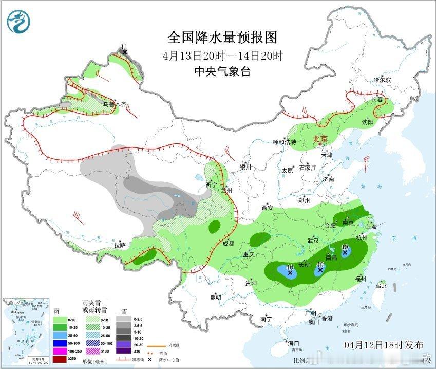 预计4月13日20时至14日20时,新疆阿勒泰和沿天山地区、青海大部、西藏北部、川西高原北部等地部分地区有小到中雪或雨夹雪,其中新疆阿勒泰地区局地有大到暴雪(10~11毫米);四川盆地东北部、贵州东部、湖南中南部、江西中北部、浙江西南部、福建西北部、安徽中部、江苏南部等地部分地区有中雨,其中,湖南西南部、江西西部和东北部等地部分地区有大雨(25~45毫米)。