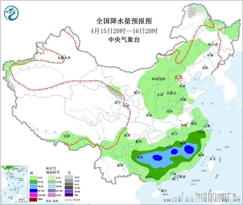 预计4月14日20时至15日20时,新疆沿天山地区、青海北部和东部等地部分地区有小到中雪或雨夹雪。贵州东南部、湖南中南部、江西西部和南部、浙江中部、福建中部、广西北部、广东北部等地部分地区有中到大雨,其中,湖南东部、江西西部局地有暴雨(50~60毫米)。