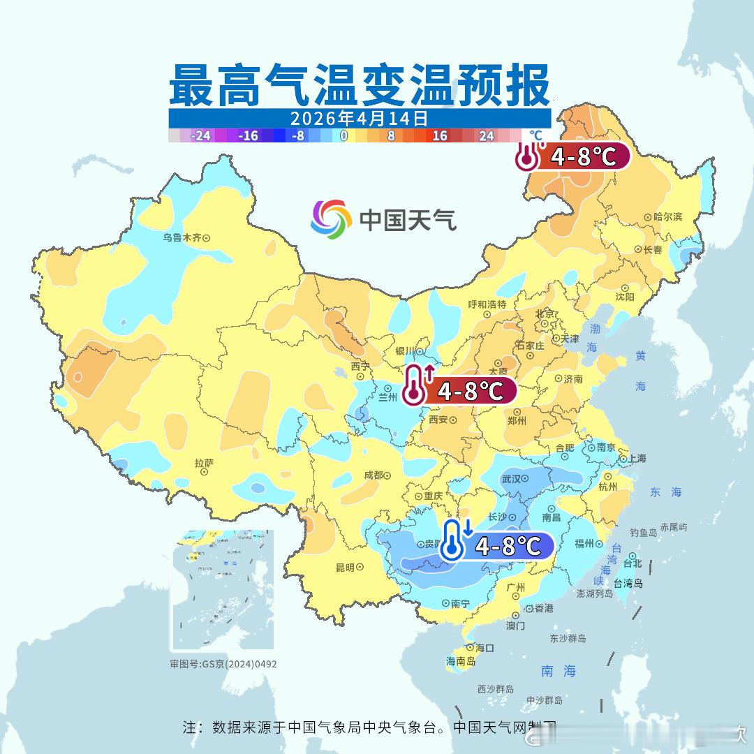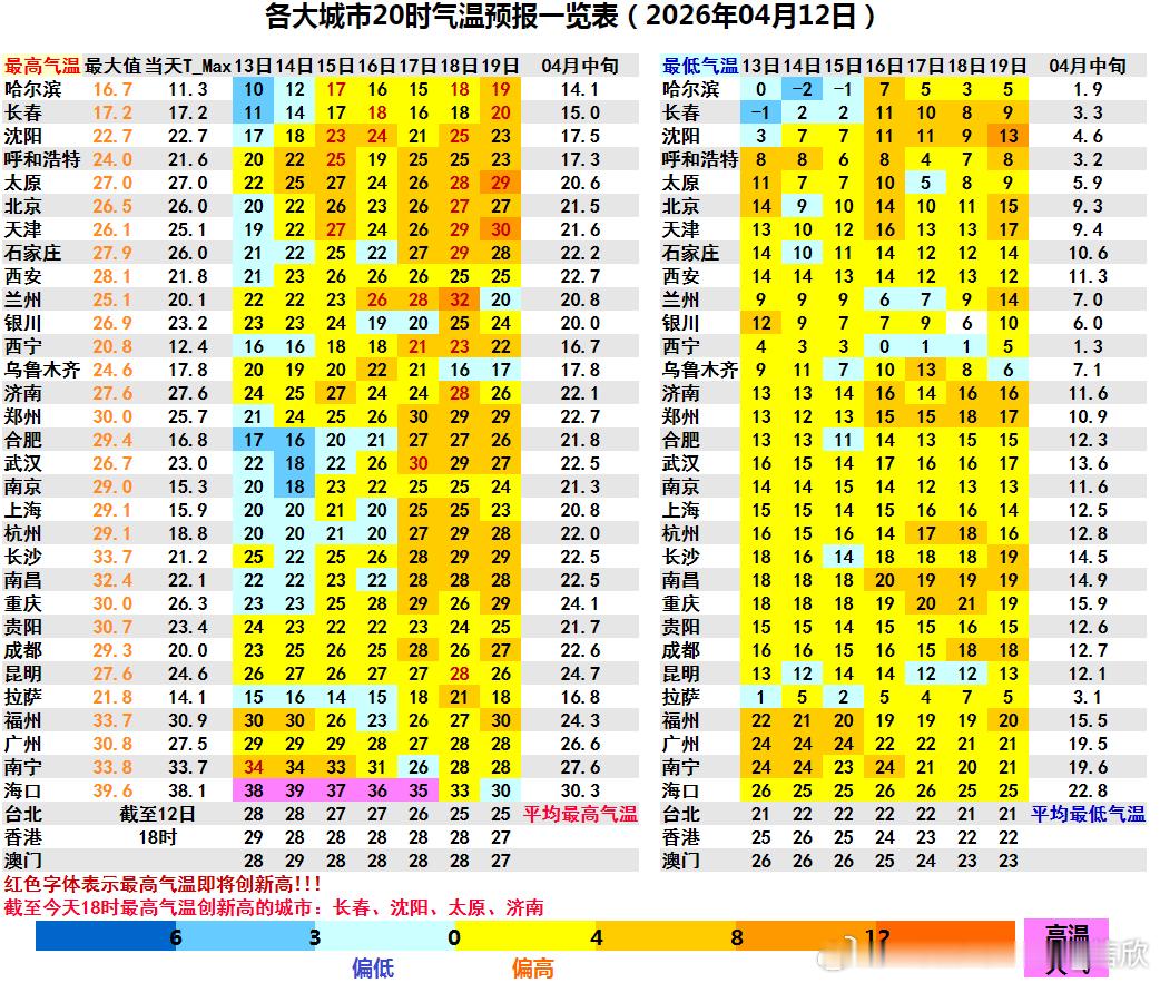 【气温】今天海南继续出现高温。明天海口将打破4月最长连续高温日数纪录,目前看,高温持续到17日,纪录将改写为13天。今天最高气温,长春17.2℃、沈阳22.7℃、太原27℃、济南27.6℃,创今年新高。而且高于南京、上海等江南城市,形成了南北倒挂。