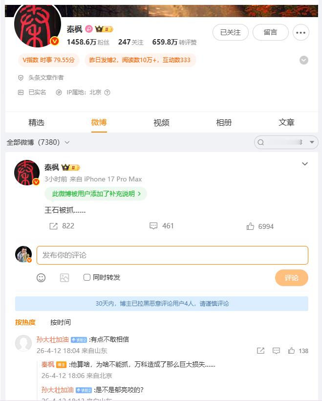 王石否认被抓 我非常赞他们的诉求,法治社会就应该法制化的去解决问题,造谣者理应受到惩罚!但我们可以沿着同等标准走,是不是房地产相关的所有历史问题都应该走法治化程序?也就是往清楚的查,这是一个很朴素的需求吧,总不能又搬出来兹事体大的借口吧!田朴珺回应网传王石被抓王石 秦枫