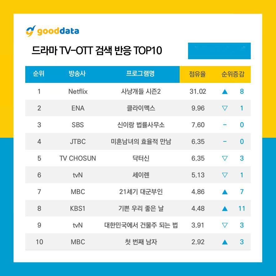 电视剧搜索关键词TOP101.《猎犬2》出演阵容2.《猎犬2》基本情报3.《猎犬2》几集4.《我们愉快的好日子》登场人物5.《权欲之巅》登场人物6.《魔女之吻》几集7.《权欲之巅》重播8.《申医生》登场人物9.《神与律师事务所》重播10.《在大韩民国成为房主的方法》基本情报