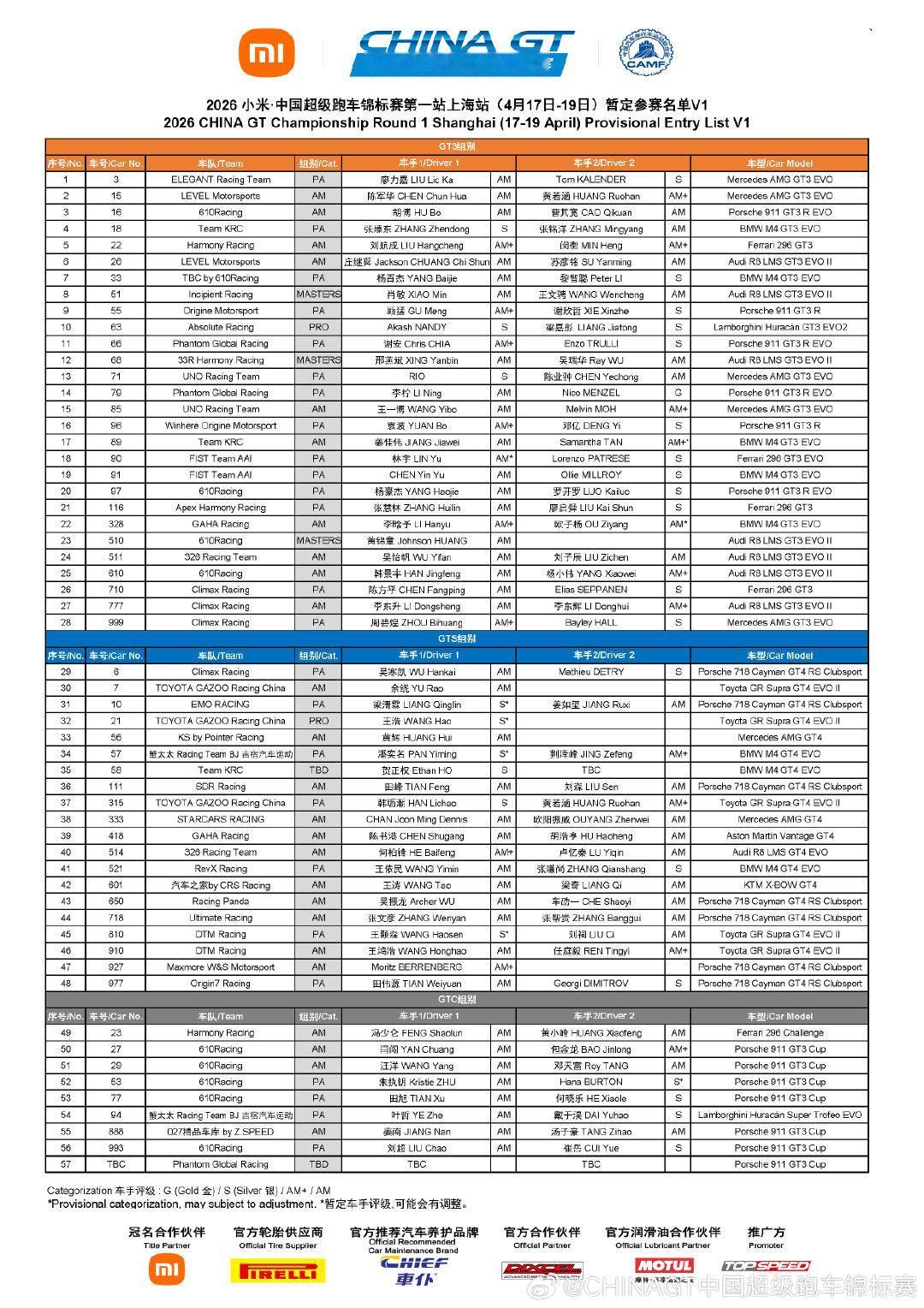 关注的六位车手中,五位主攻GT世界挑战赛亚洲杯 GTWC Asia。叶一飞除了亚洲杯外,还是WEC(世界汽车耐力锦标赛,与F1并称赛车两大金字塔顶端赛事)最顶Hypercar组主力车手,拿了勒芒全场冠军的首位中国车手。