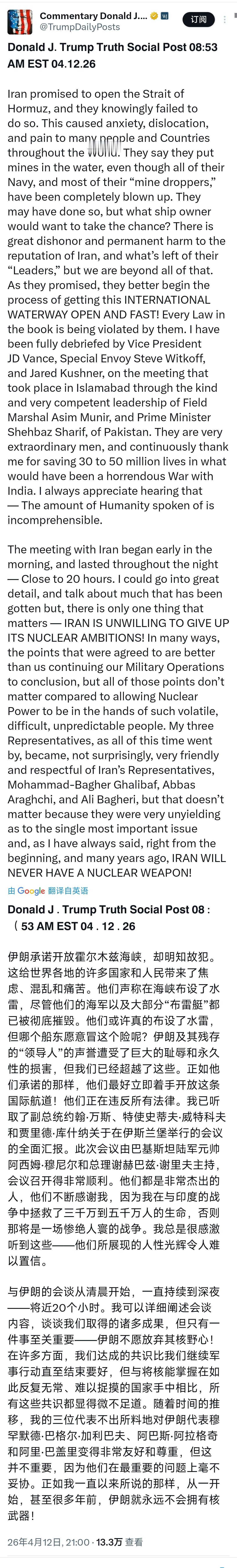 特朗普今晚(北京时间4月12日晚)发长文指责伊朗;“伊朗承诺开放霍尔木兹海峡,却明知故犯。这给世界各地的许多国家和人民带来了焦虑,混乱和痛苦。他们声称在海峡布设了水雷,尽管他们的海军以及大部分‘布雷艇’都已被彻底摧毁。他们或许真的布设了水雷但哪个船东愿意冒这个险呢?伊朗及其残存的‘领导人’的声誉遭受了巨大的耻辱和永久性的损害,但我们已经超越了这些。正如他们承诺的那样,他们最好立即着手开放这条国际航道!他们正在违反所有法律。我已听取了副总统JD万斯,特使史蒂夫·威特科夫和贾里德·库什纳关于在伊斯兰堡举行的会议的全面汇报。此次会议由巴基斯坦陆军元帅阿西姆·穆尼尔和总理谢赫巴兹·谢里夫主持会议召开得非常顺利。他们都是非常杰出的人,他们不断感谢我,因为我在与印度的战争中拯救了三千万到五千万人的生命,否则那将是一场惨绝人寰的战争。我总是很感激听到这些——他们所展现的人性光辉令人难以置信。