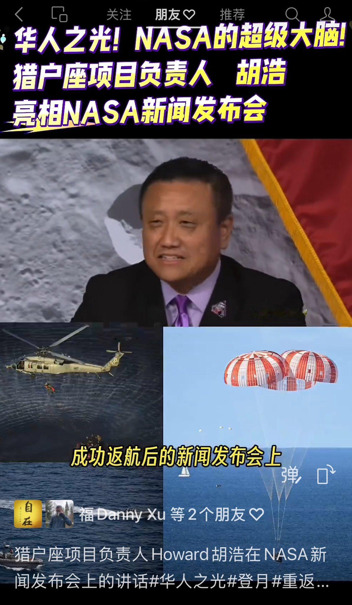 猎户座项目的负责人胡浩,在NASA新闻发布会上,以总工程师和负责人身份感谢团队、