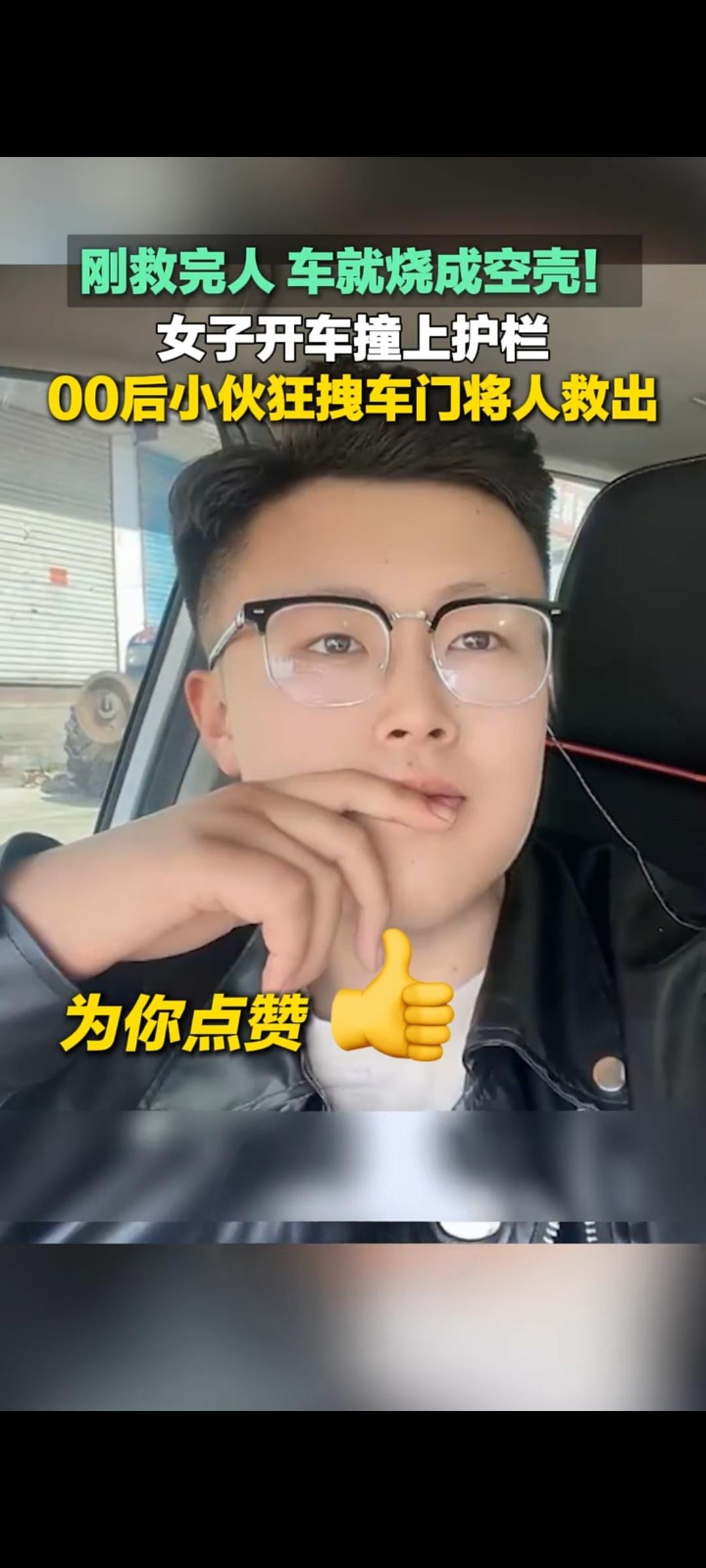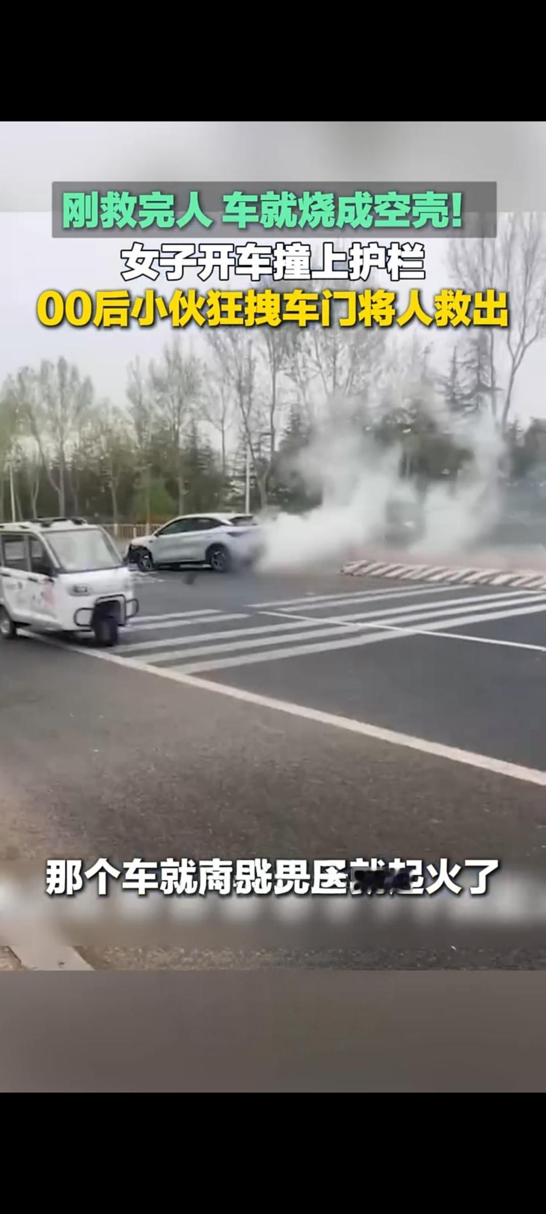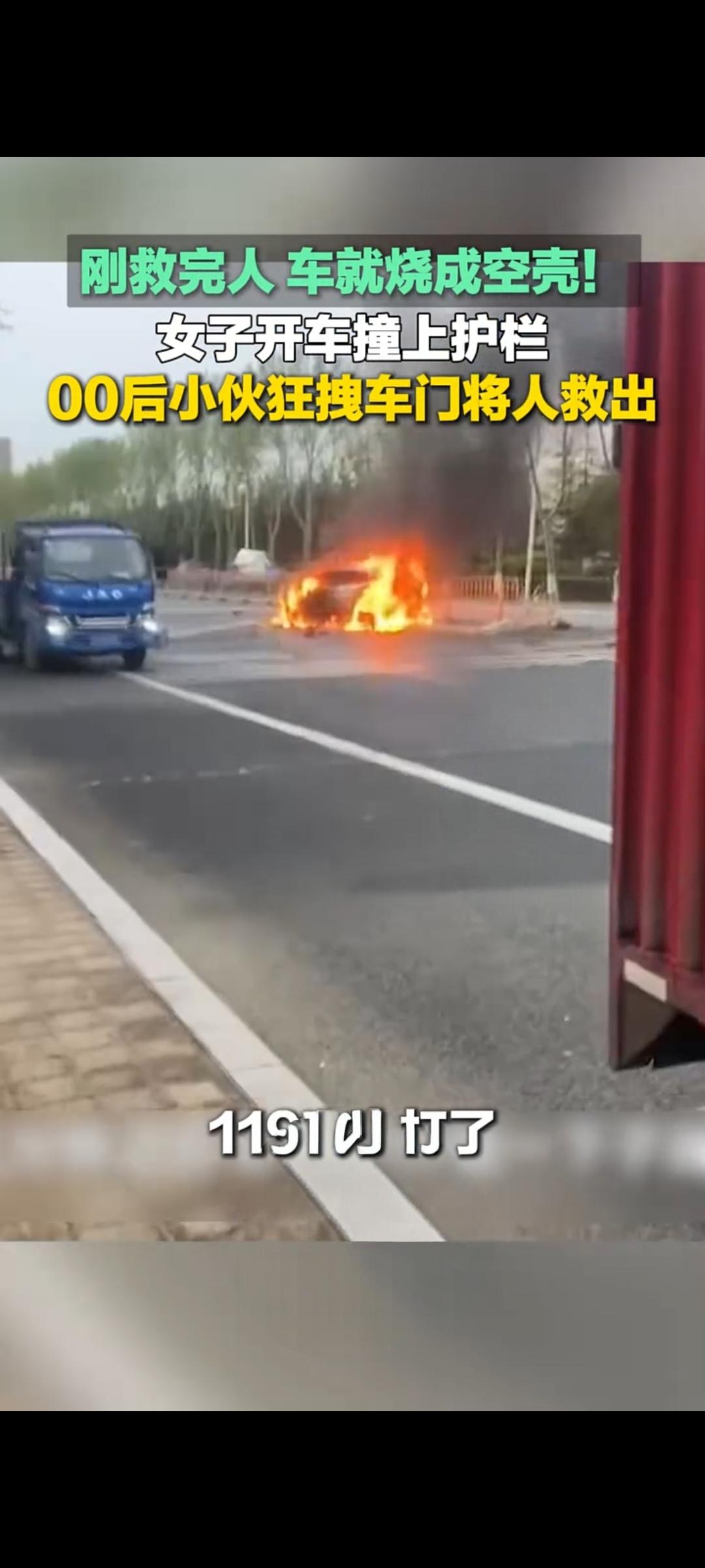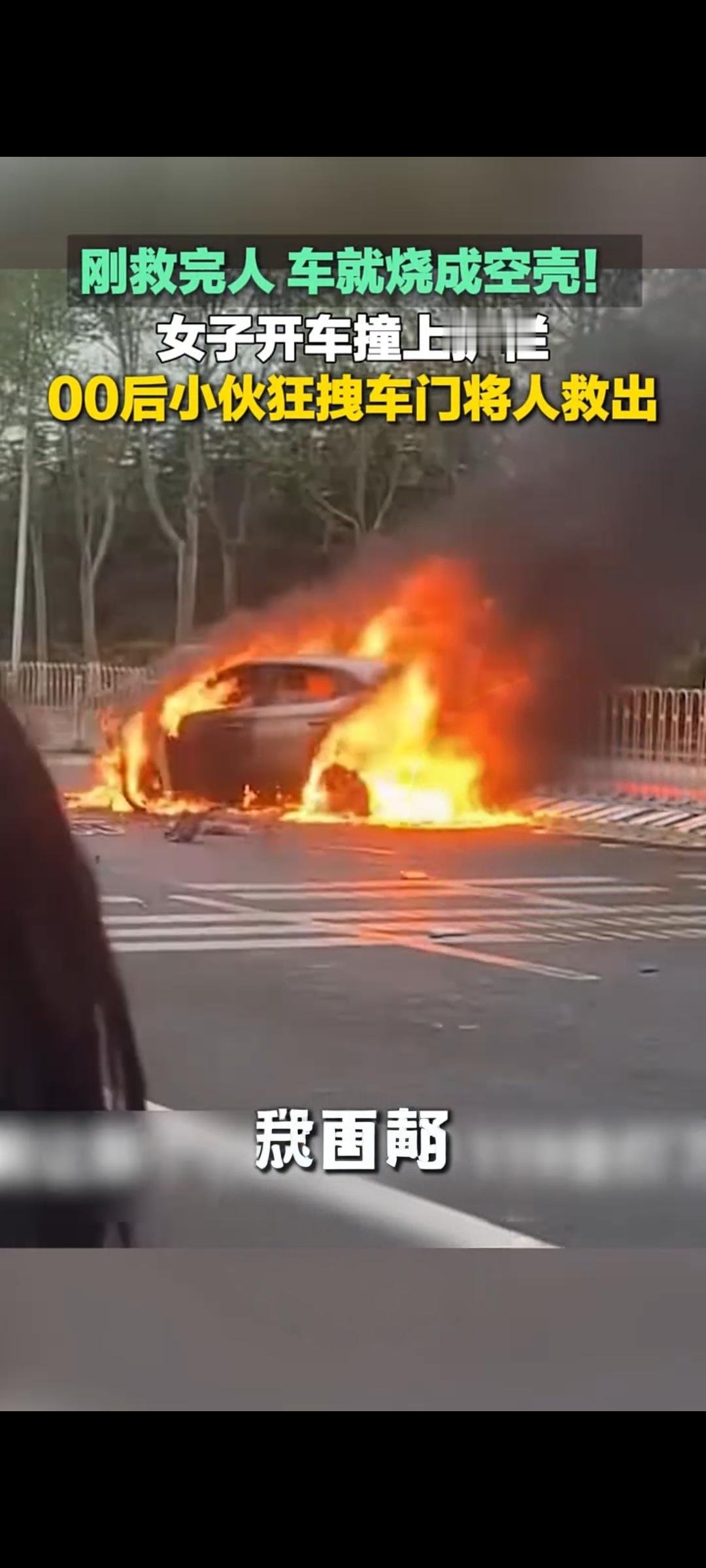 4月12日,山东临沂发生一起惊险交通事故。一名女子驾车失控撞上护栏后被困车内,危急时刻,一名00后小伙挺身而出,徒手拽开变形车门成功救人,短短几分钟后,事故车辆便被大火吞噬,烧成空壳。