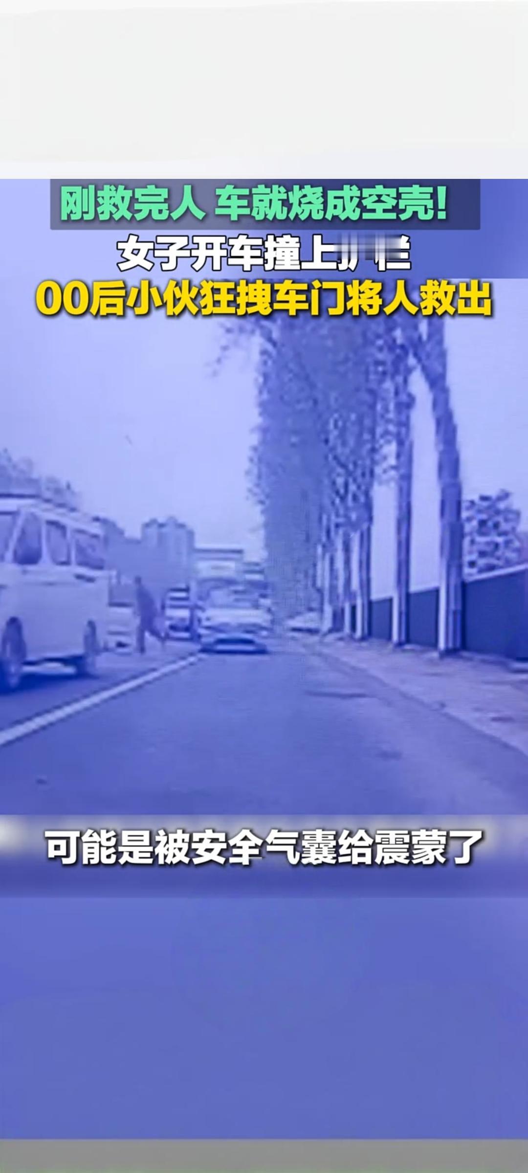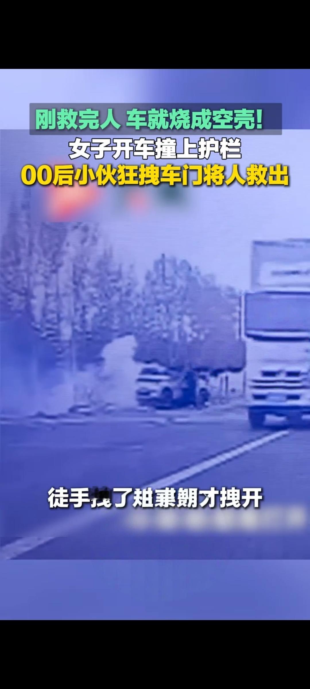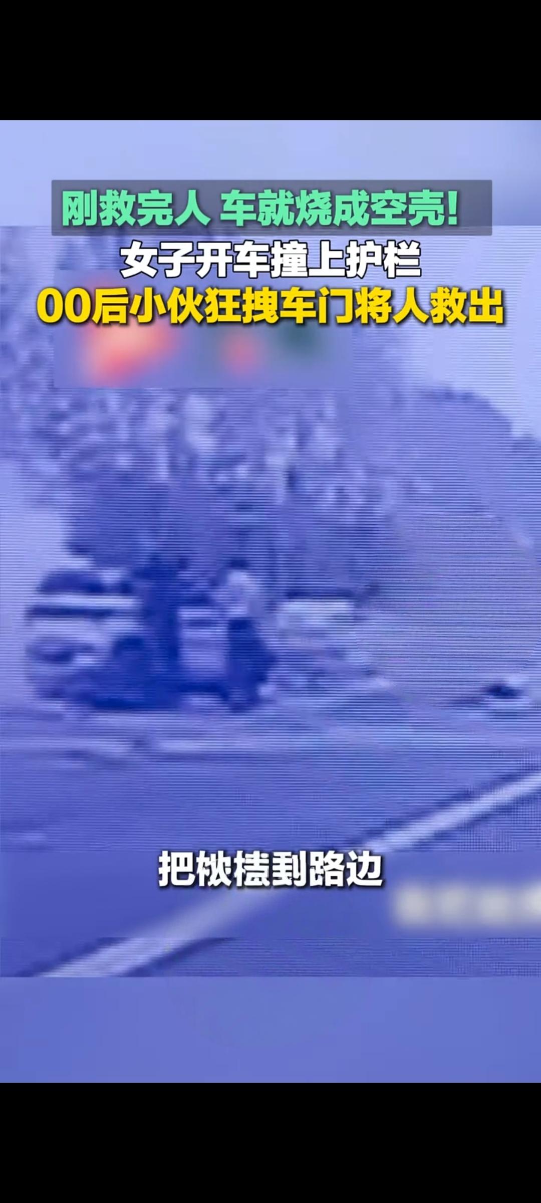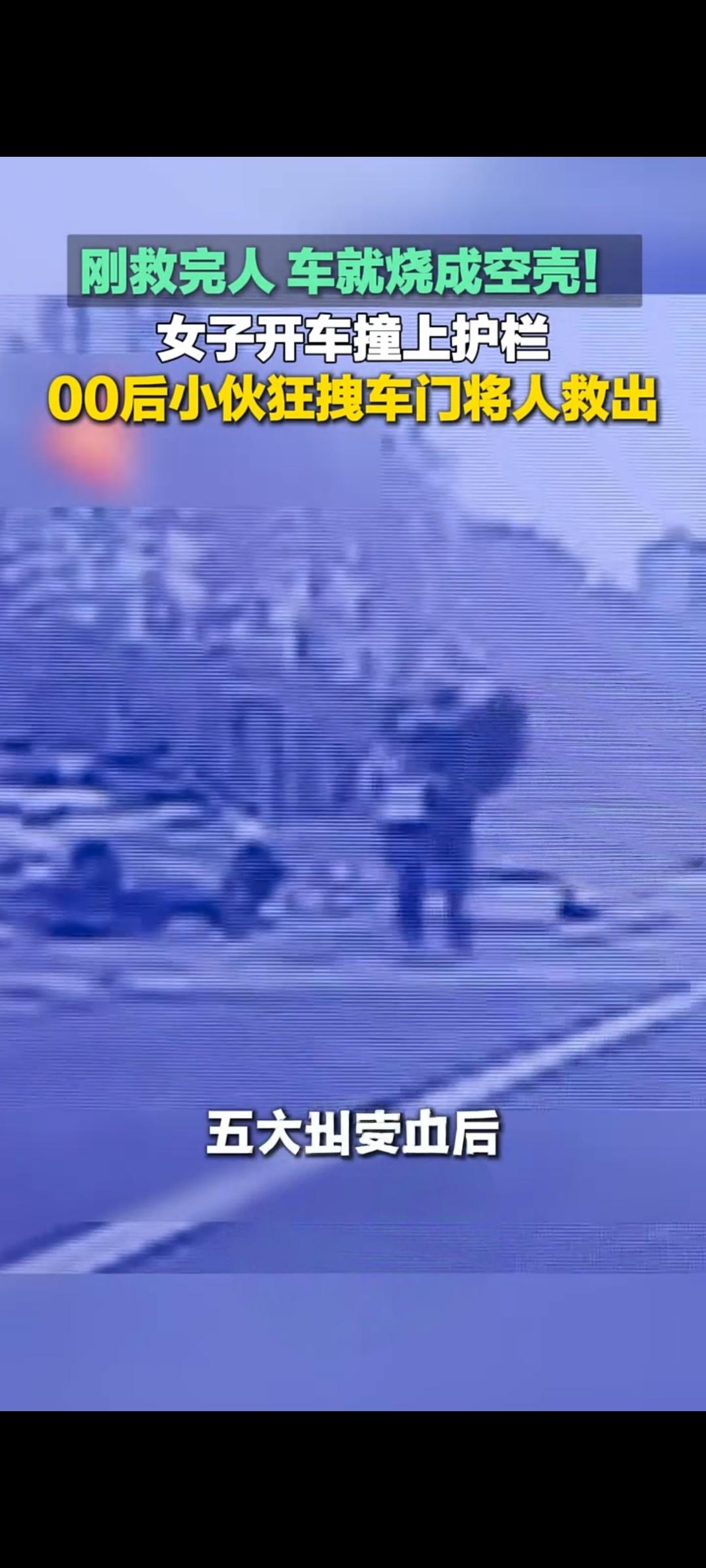 女子刚脱离险境,事故车辆就燃起大火,火势迅速蔓延,最终整车被烧得只剩一副车架,现场十分惊心 。确认女子安全后,小伙留在现场安抚并协助后续处置,随后默默离开。